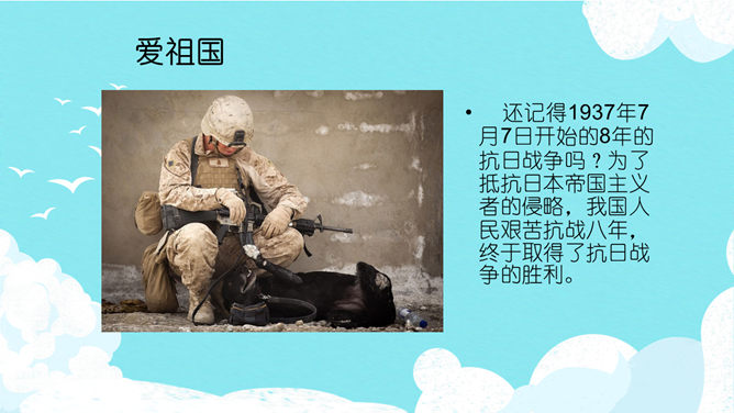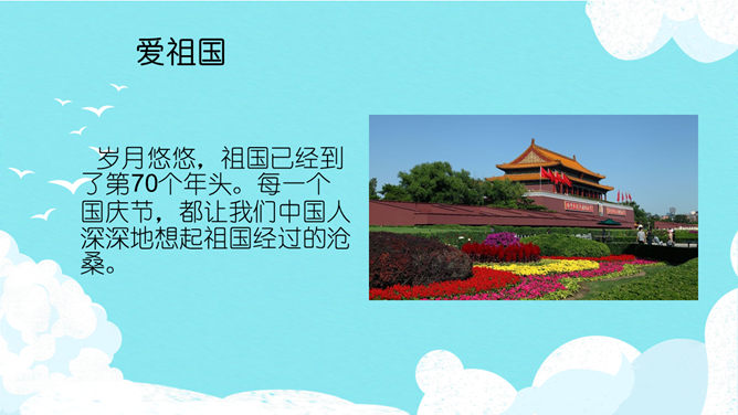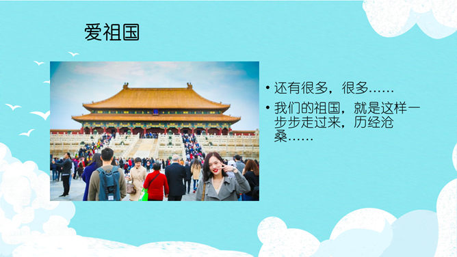 爱祖国爱家乡爱学校班会PPT模板。一套爱祖国爱家乡爱学校主题班会幻灯片模板,自行更换图片文字即可。