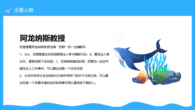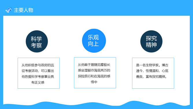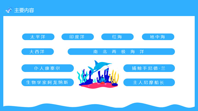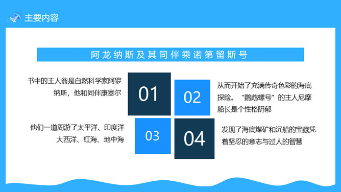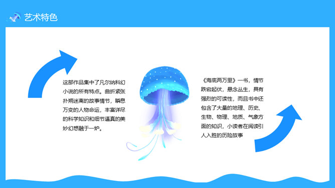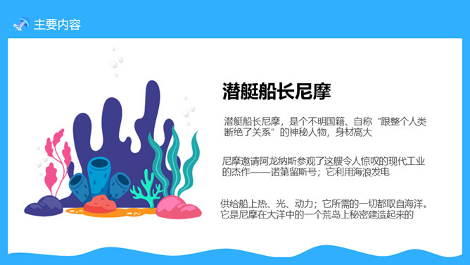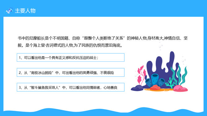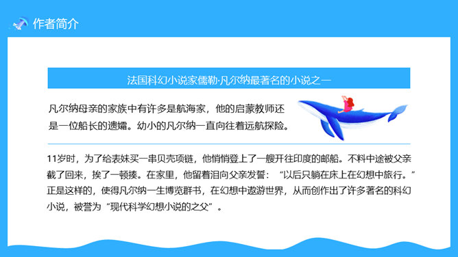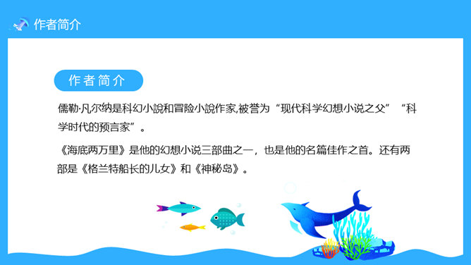 一套法国凡尔纳名著《海底两万里》读书心得分享课件,卡通海底元素设计。凡尔纳母亲的家族中有许多是航海家,他的启蒙教师还是一位船长的遗孀。幼小的凡尔纳一直向往着远航探险。11岁时,为了给表妹买一串贝壳项链,他悄悄登上了一艘开往印度的邮船。不料中途被父亲截了回来,挨了一顿揍。在家里,他留着泪向父亲发誓:“以后只躺在床上在幻想中旅行。”正是这样的,使得凡尔纳一生博览群书,在幻想中遨游世界,从而创作出了许多著名的科幻小说,被誉为“现代科学幻想小说的之父”。所属专题:海底两万里ppt。