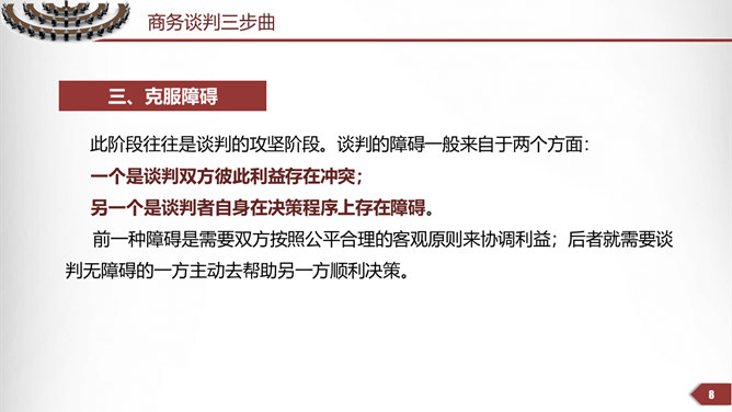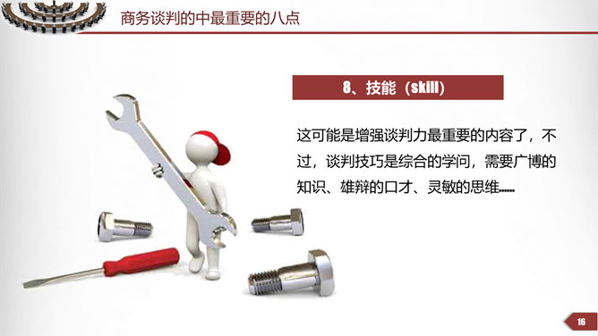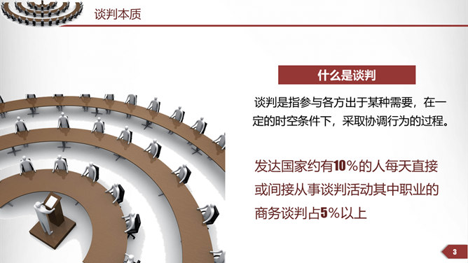 商务谈判技巧培训PPT模板。第一部分谈判本质,第二部分谈判原则,第三部分谈判者的素质,第四部分谈判的过程。