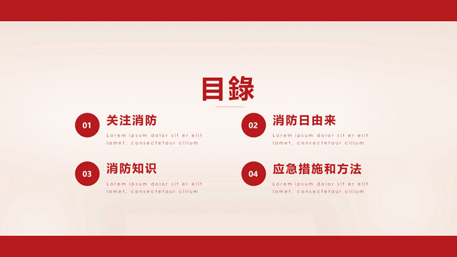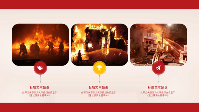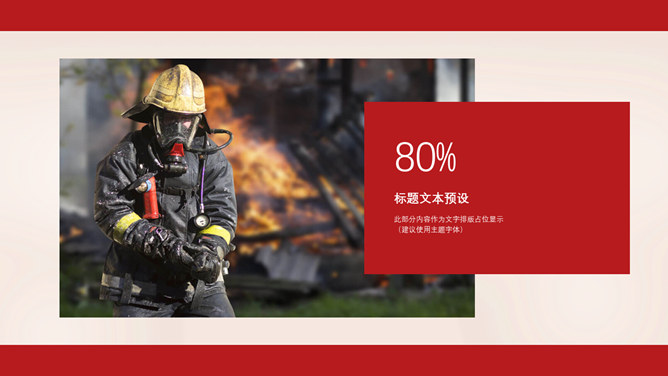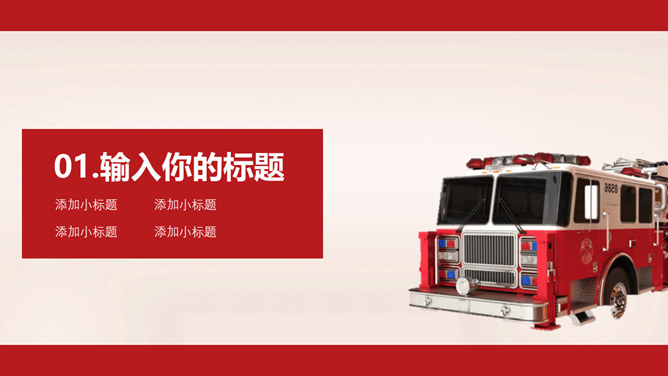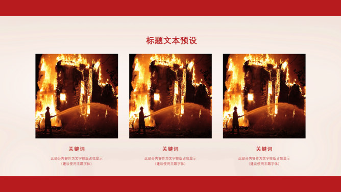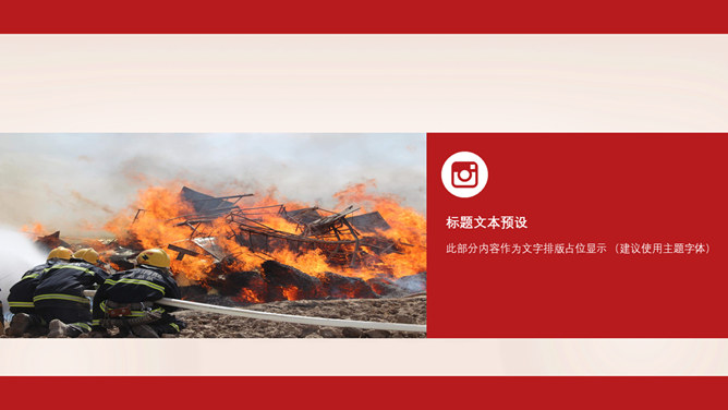 消防宣传日防火PPT模板。一套消防防火主题幻灯片模板,大气红色主色调,适合消防宣传活动等用途。