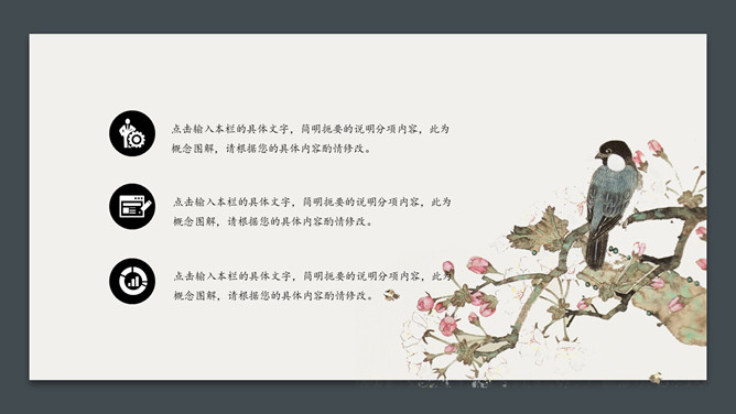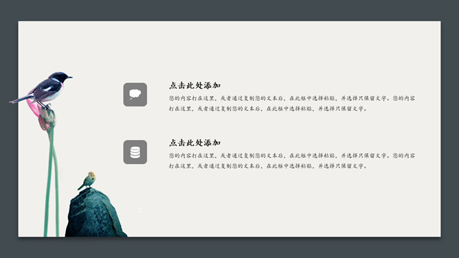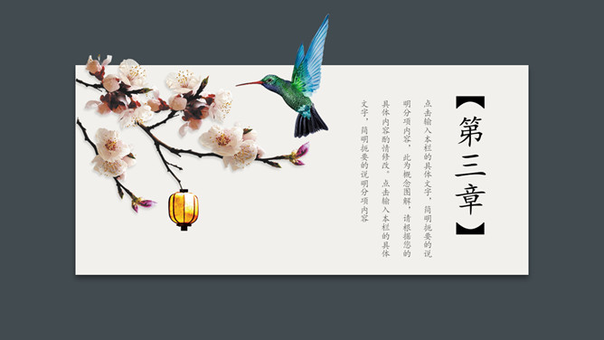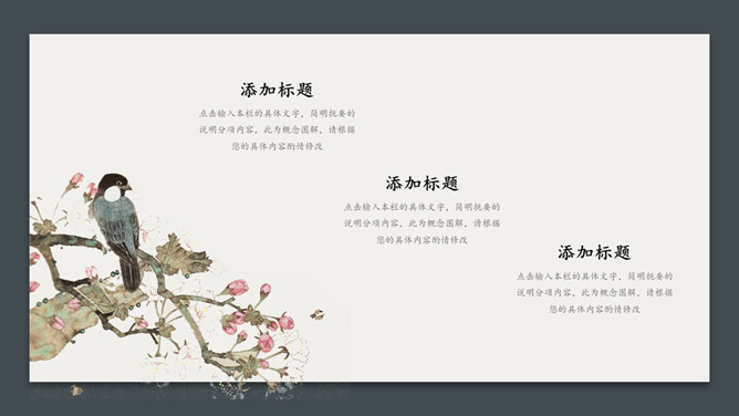 卡片花鸟唯美中国风PPT模板。一套简约中国风幻灯片模板,卡片式效果设计,唯美花鸟素材装饰,简洁大方。