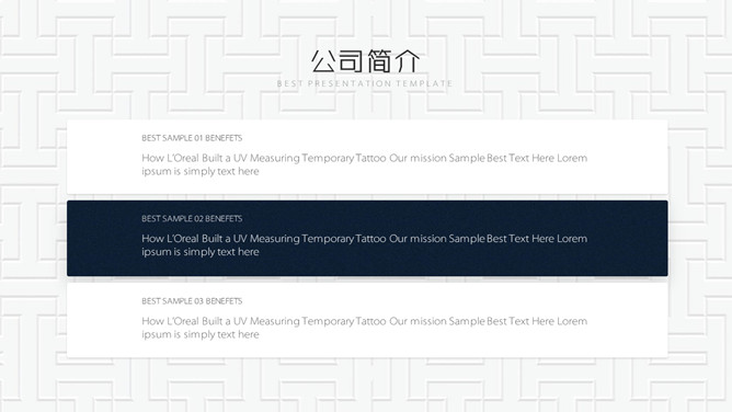 高端质感时尚商务PPT模板。一套精美商业计划书模板,质感纹理背景,简约时尚设计,使用字体:
