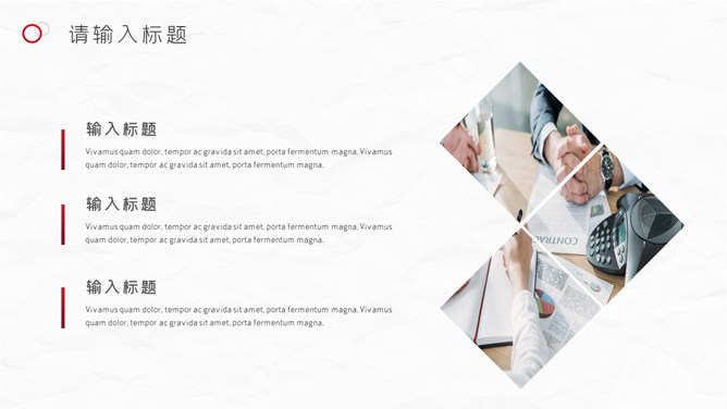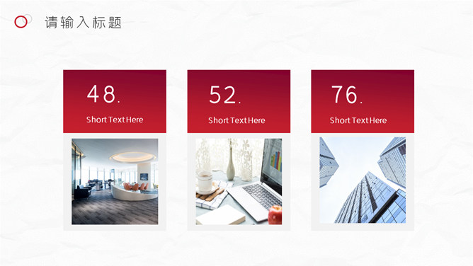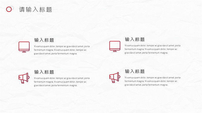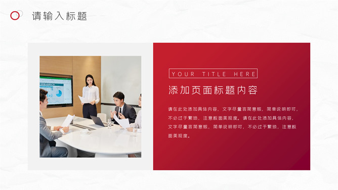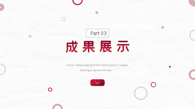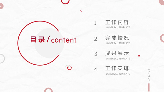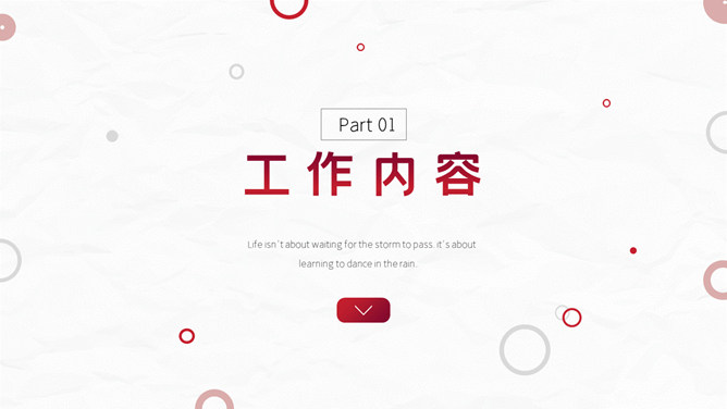 红色圆圈工作总结PPT模板。一套年终工作总结汇报幻灯片模板,质感灰白背景,大气红色主色调,圆圈装饰,简约设计。