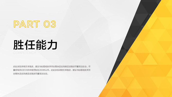 求职竞聘个人简历PPT模板。一套个人简历幻灯片模板,时尚黑黄配色,简约设计,适合求职、岗位竞聘等用途。
