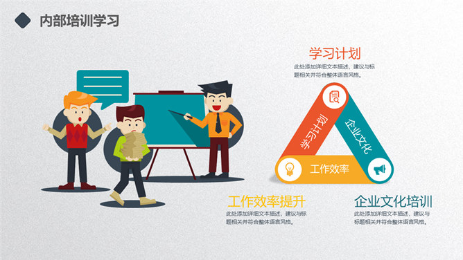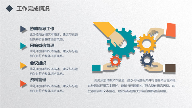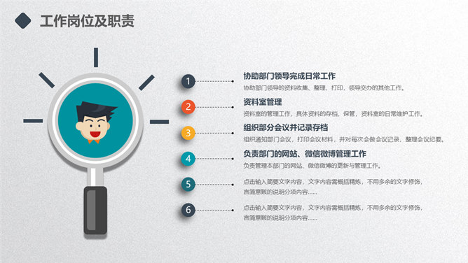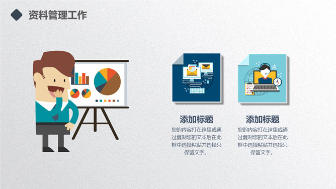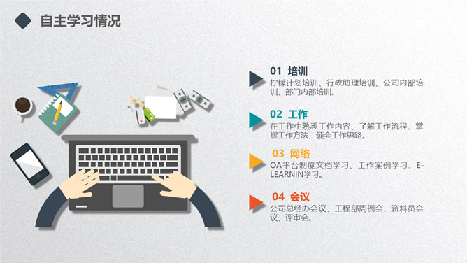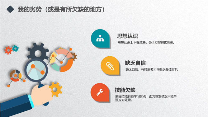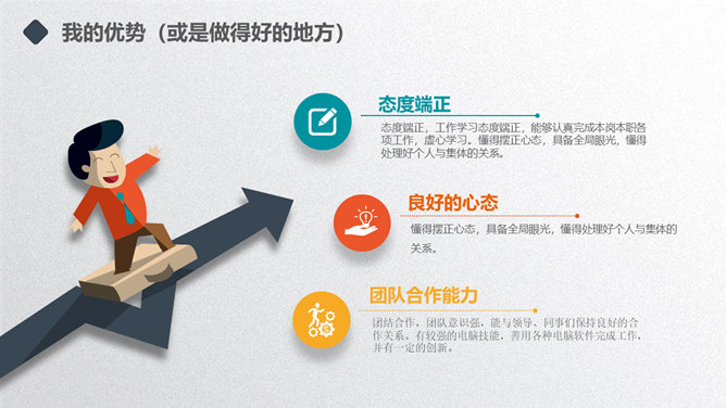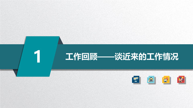矢量趣味述职报告PPT模板。一套年终述职报告幻灯片模板,扁平化矢量风格,趣味小人设计,多彩配色,动态播放。