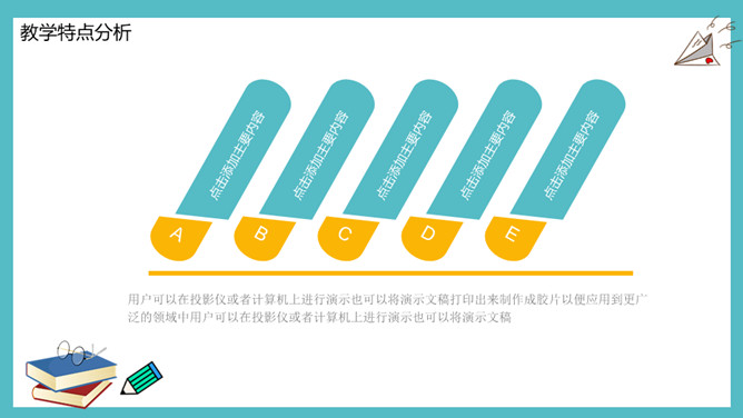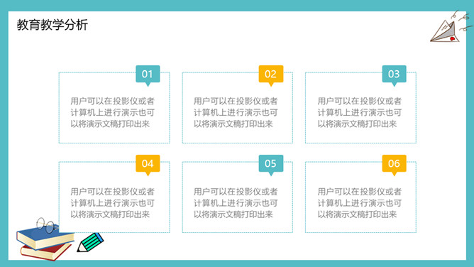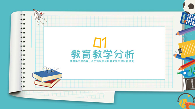 笔记本教育教学说课PPT模板。一套教育教学课件幻灯片模板,卡通笔记本文具背景,适合教学分析、说课等用途。