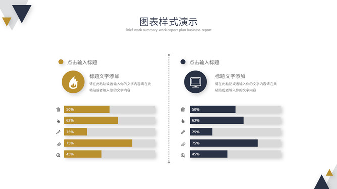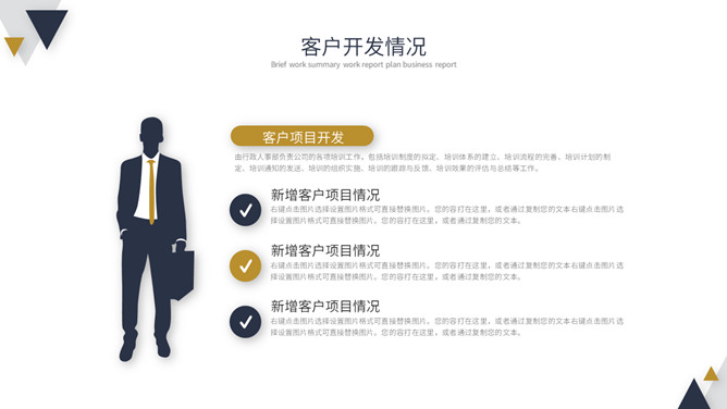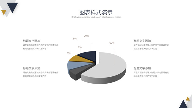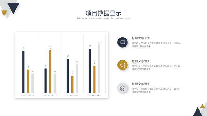 三角风简约大气通用PT模板。一套简洁通用幻灯片模板,三角元素装饰,蓝金配色,页面类型多样,通用性强。