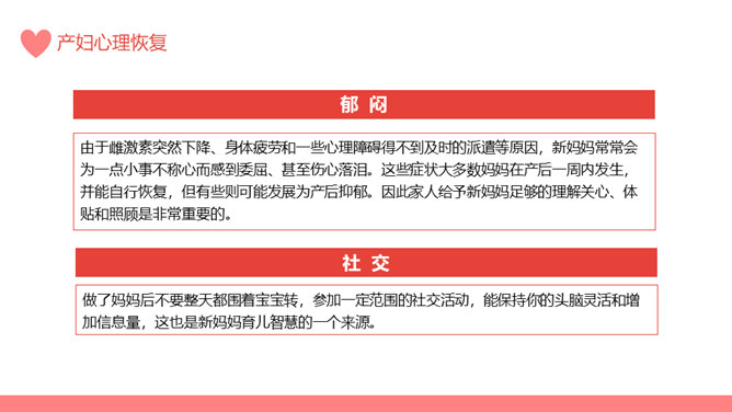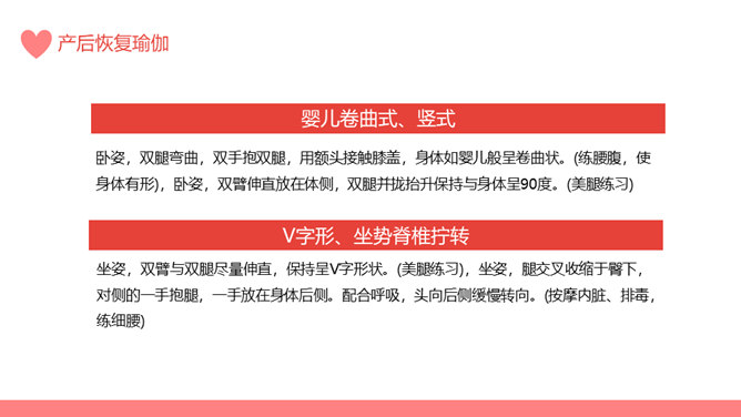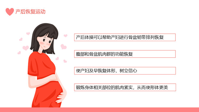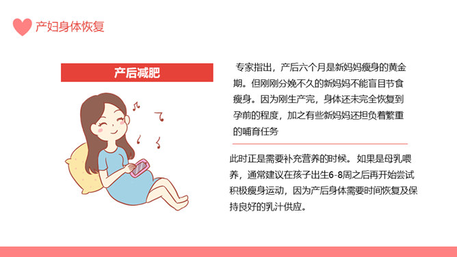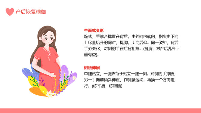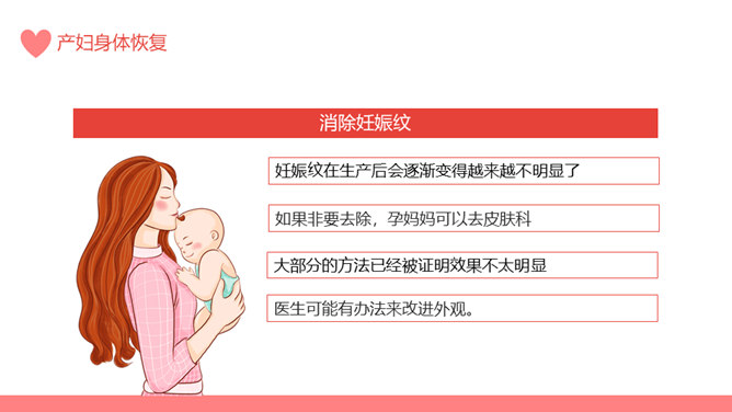 产后康复产妇健康保健PPT模板。产妇身体恢复、产后恢复运动、产后恢复瑜伽、产妇健康饮食、产妇心理恢复。