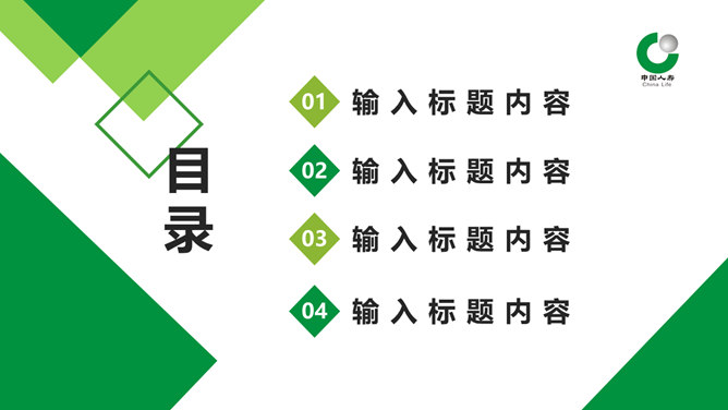 中国人寿专用工作总结PPT模板。一套中国人寿保险公司专用工作总结汇报幻灯片模板,简约大气,绿色配色。