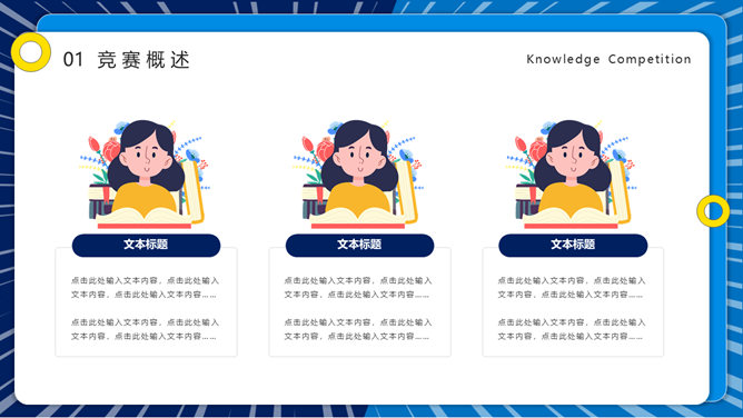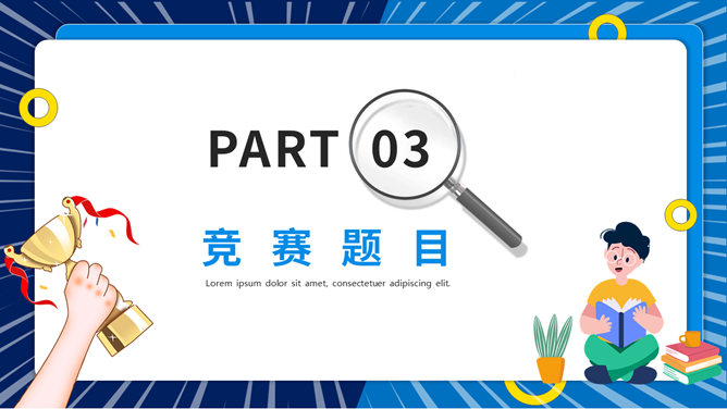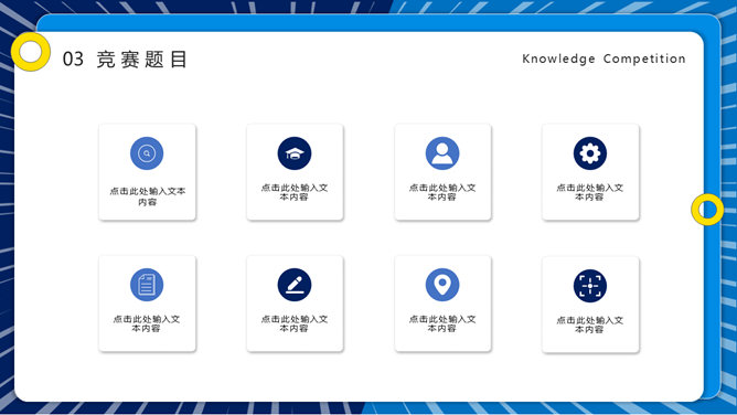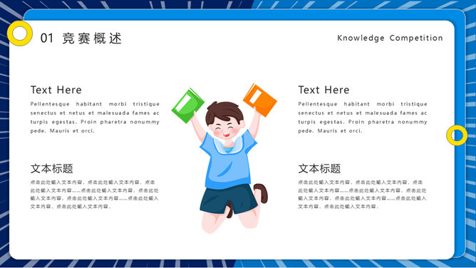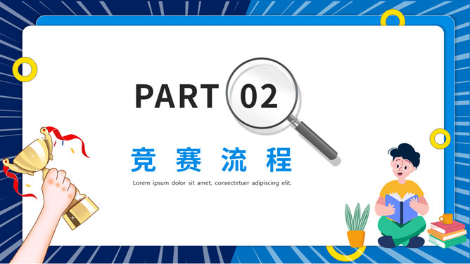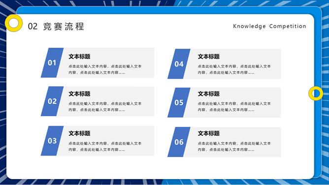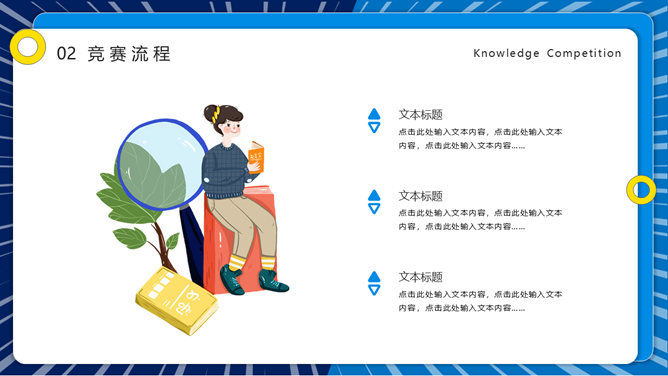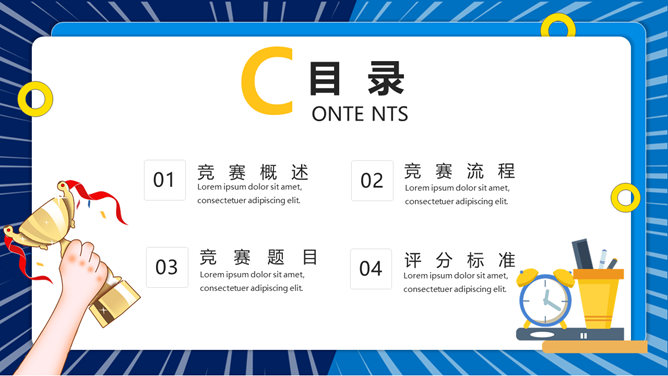 知识竞赛活动策划PPT模板。一套知识竞答活动模板,包括竞赛概述、竞赛流程、竞赛题目、评分标准四部分。