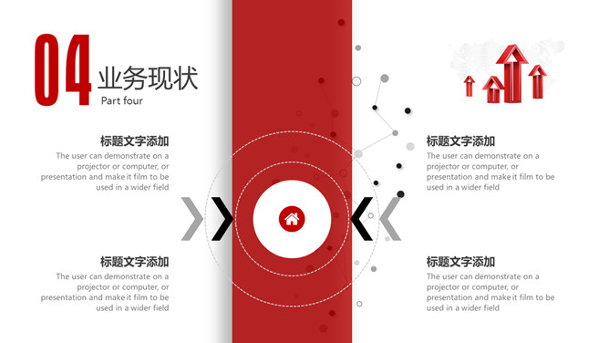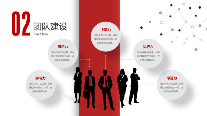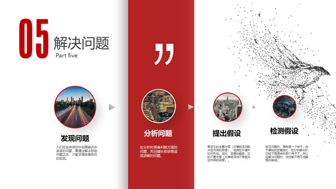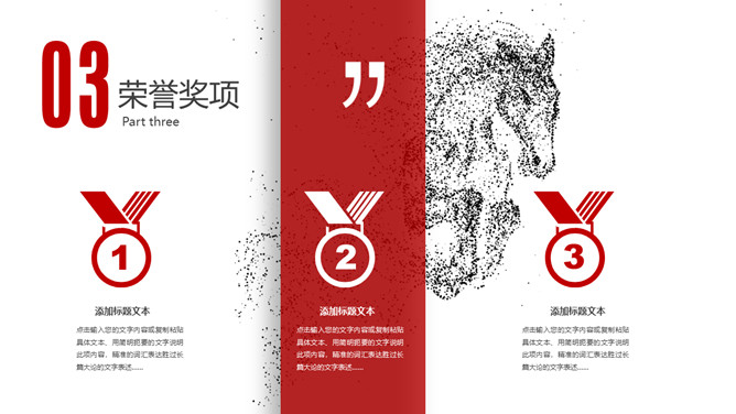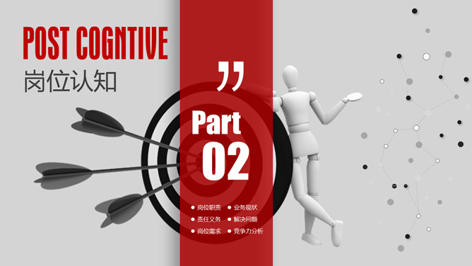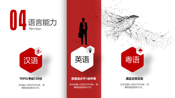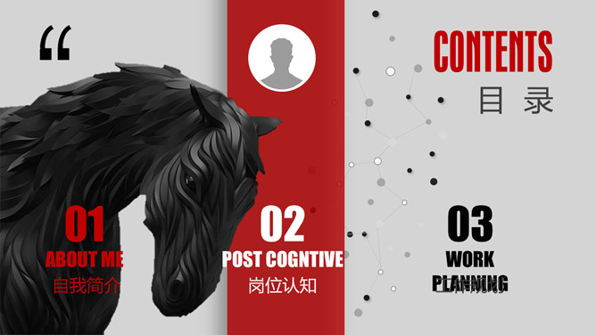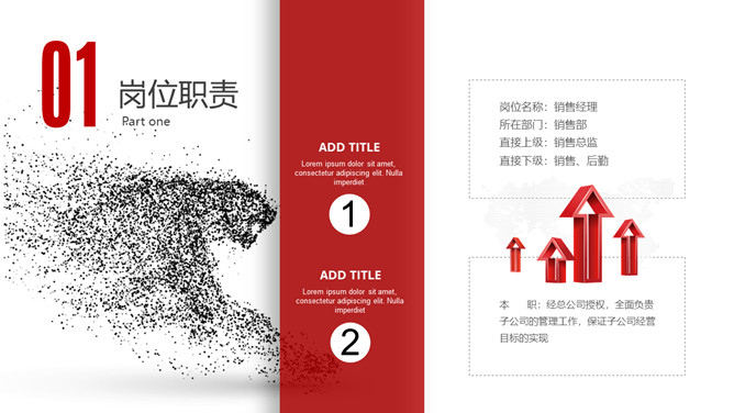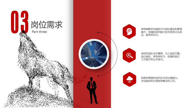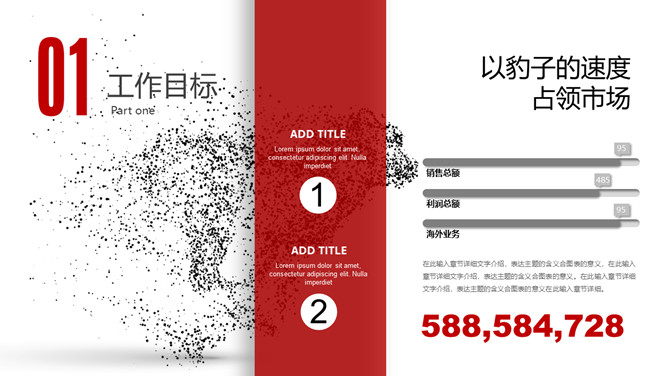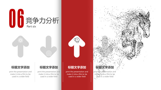 创意奔跑岗位述职竞聘PPT模板。一套岗位竞聘述职报告幻灯片模板,创意粒子艺术设计,红色长方形贯穿。
