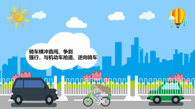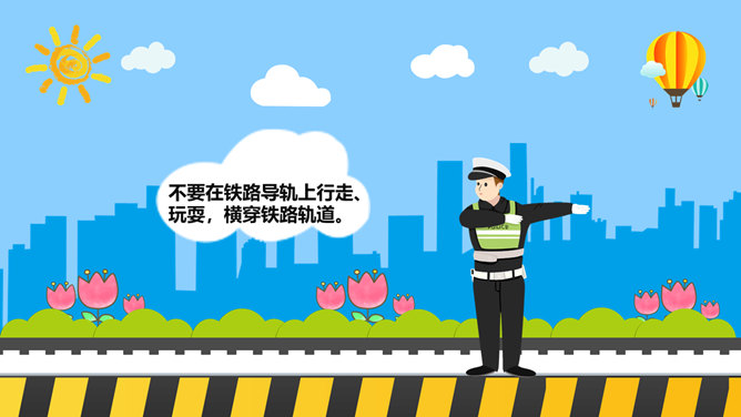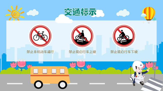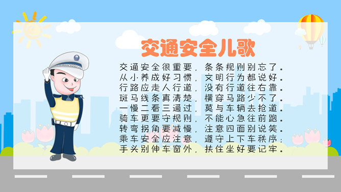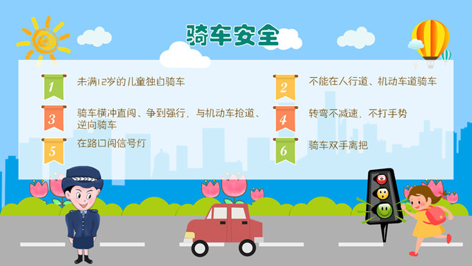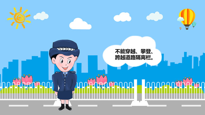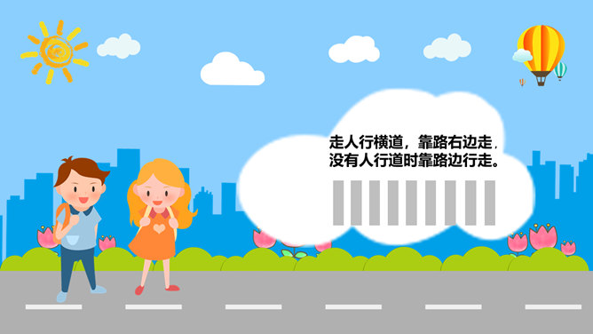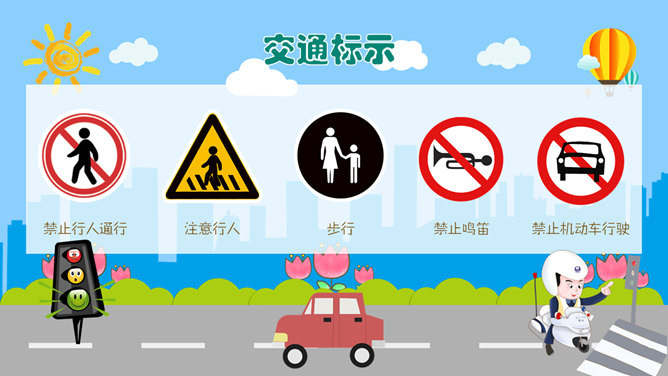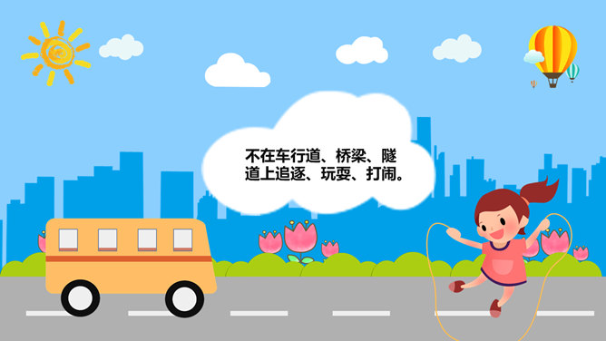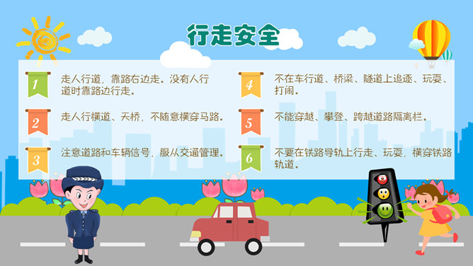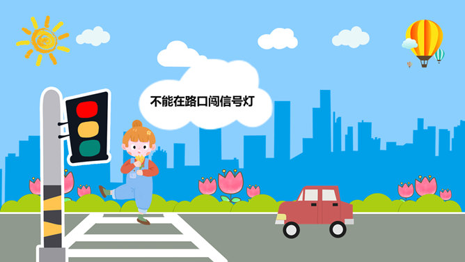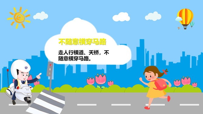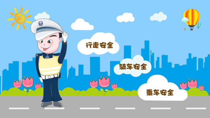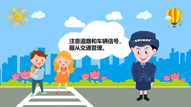 交通安全教育班会PPT模板。一套小学生道路交通安全教育主题班会幻灯片模板,卡通风格,精美实用,动态播放。