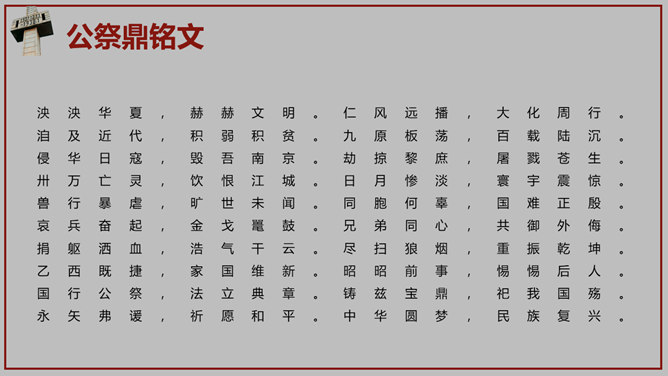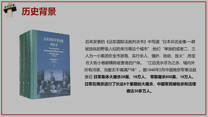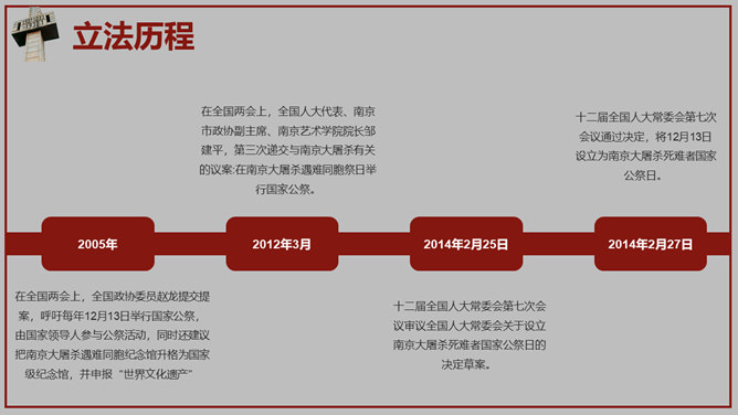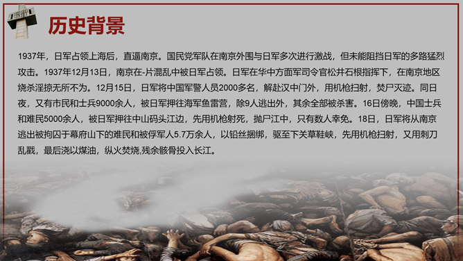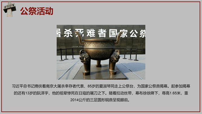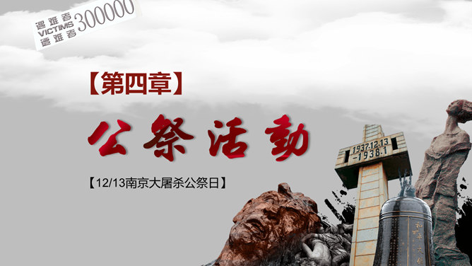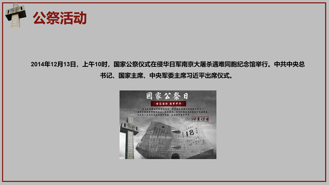 南京大屠杀国家公祭日PPT模板。一套国家公祭日主题模板,包括历史背景、罪恶行径、立法历程、公祭活动、重大意义。