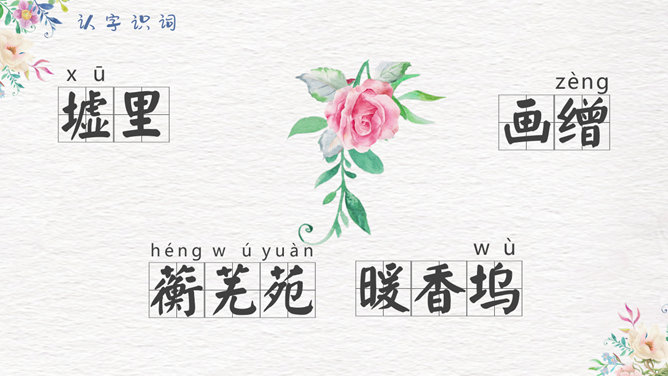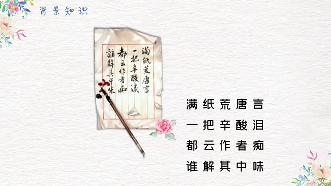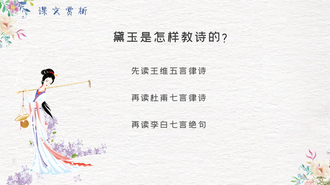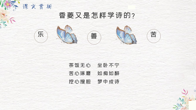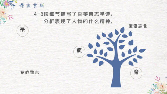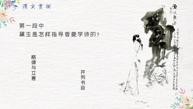 香菱学诗PPT课件8。第一段中黛玉是怎样指导香菱学诗的?开列书目、格律与立意。4-8段细节描写了香菱苦志学诗,分析表现了人物的什么精神。 黛玉是怎样教诗的?先读王维五言律诗,再读杜甫七言律诗,再读李白七言绝句。香菱又是怎样学诗的?茶饭无心 坐卧不宁 苦心琢磨 如痴如醉 挖心搜胆 梦中成诗。一起来欣赏香菱的三首诗。阅读香菱的判词。