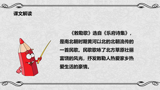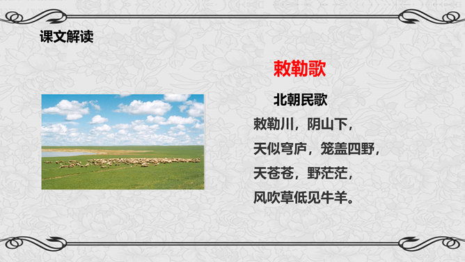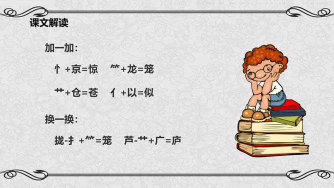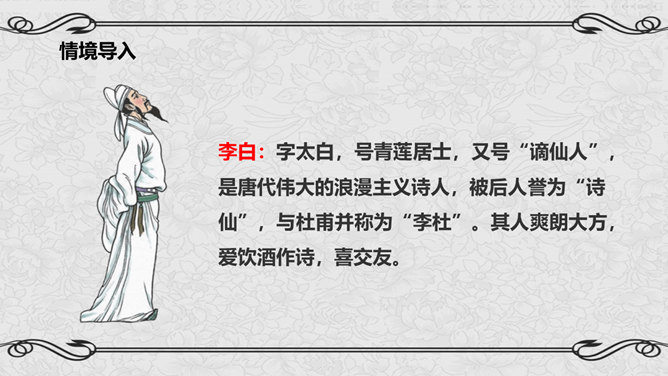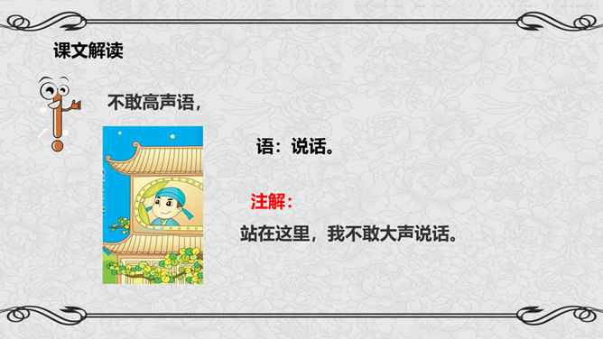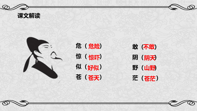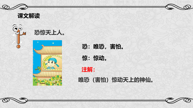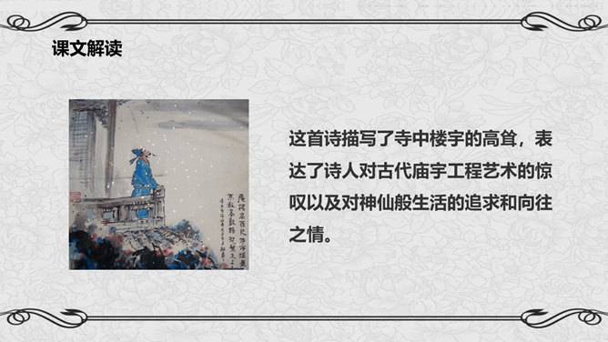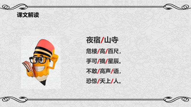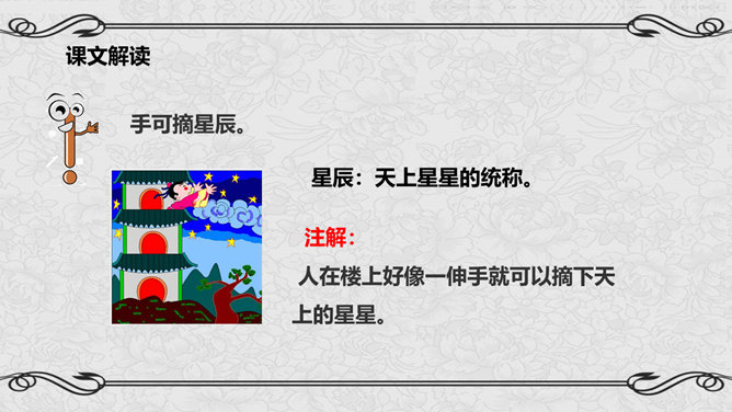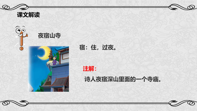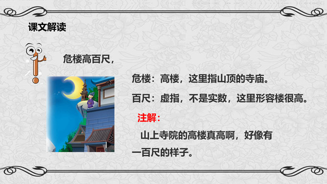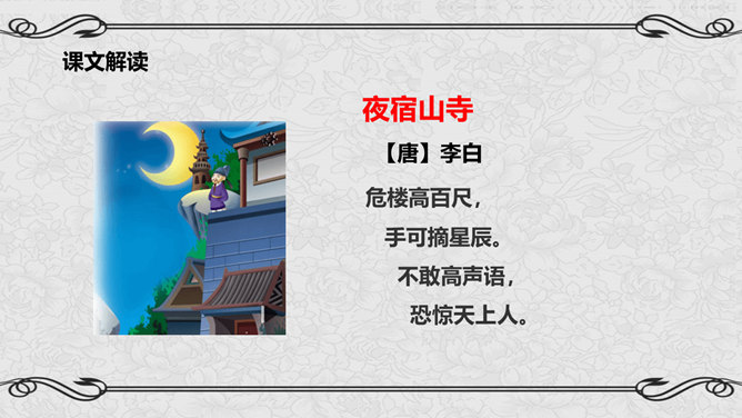古诗二首PPT课件2。夜宿山寺。宿:住,过夜。注解:诗人夜宿深山里面的一个寺庙。危楼高百尺。危楼:高楼,这里指山顶的寺庙。百尺:虚指,不是实数,这里形容楼很高。注解:山上寺院的高楼真高啊,好像有一百尺的样子。手可摘星辰。星辰:天上星星的统称。注解:人在楼上好像一伸手就可以摘下天上的星星。不敢高声语。语:说话。注解:站在这里,我不敢大声说话。恐惊天上人。恐:唯恐,害怕。惊:惊动。注解:唯恐(害怕)惊动天上的神仙。这首诗描写了寺中楼宇的高耸,表达了诗人对古代庙宇工程艺术的惊叹以及对神仙般生活的追求和向往之情。