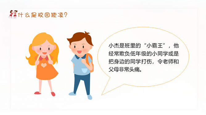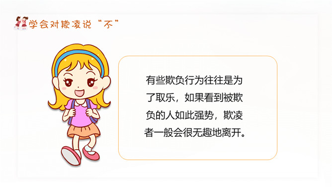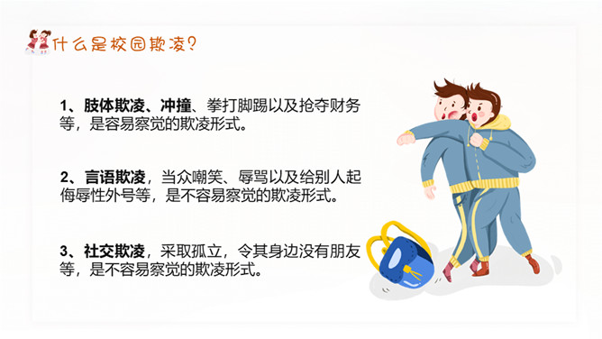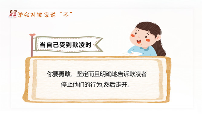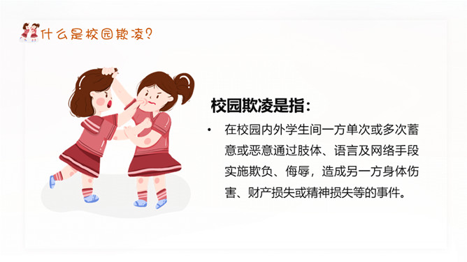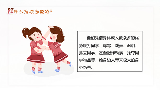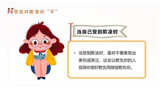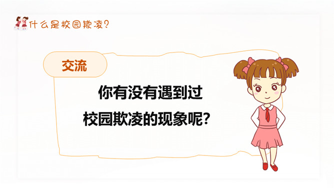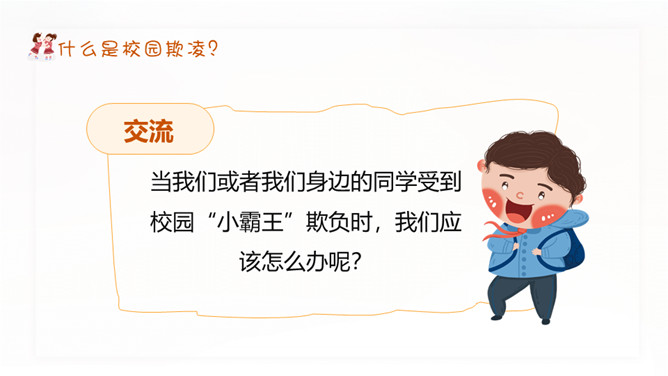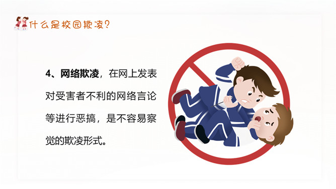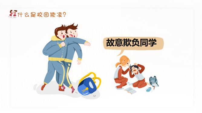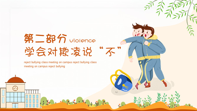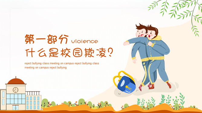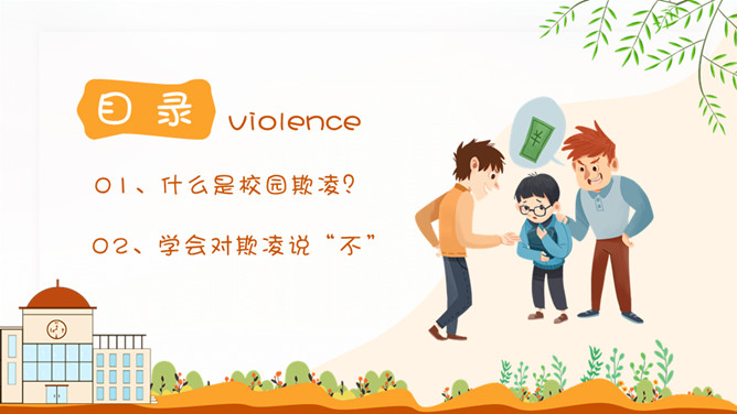 拒绝校园暴力欺凌班会PPT模板。什么是校园欺凌?学会对欺凌霸凌说“不”。适合中小学反欺凌教育班会等。