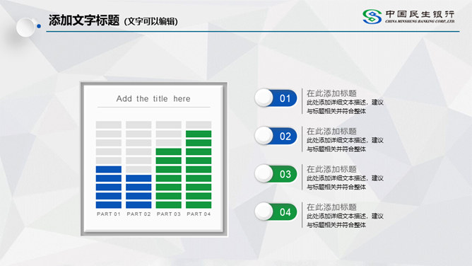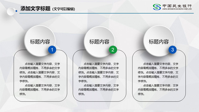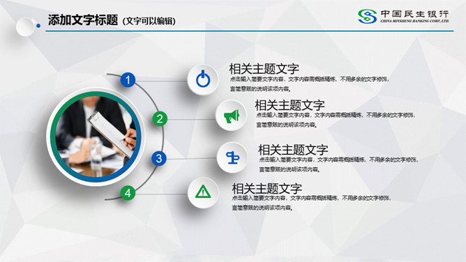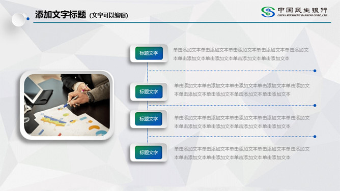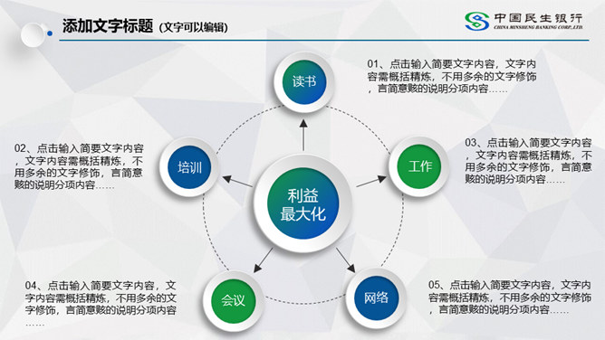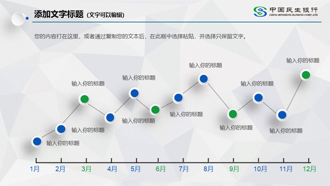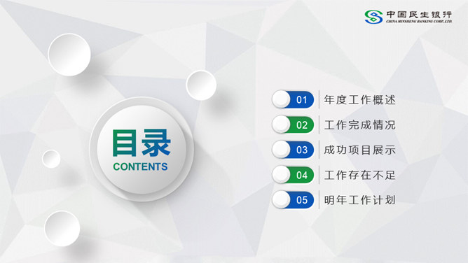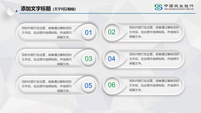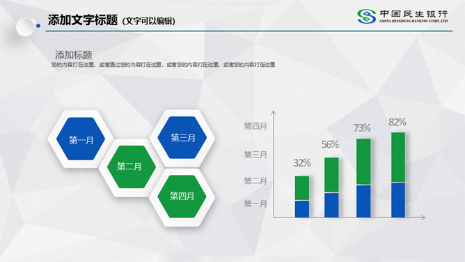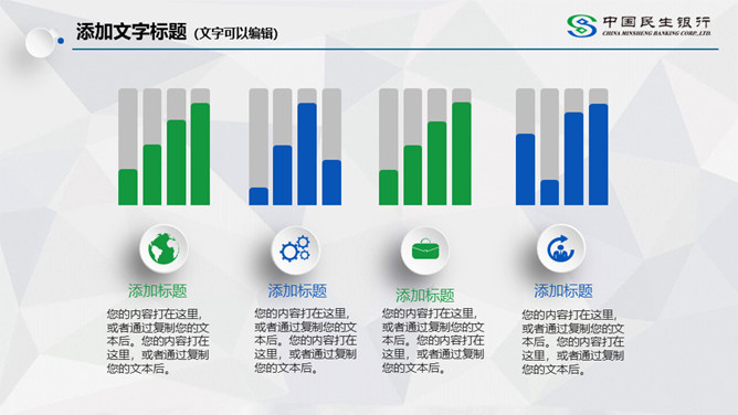 中国民生银行专用PPT模板。一套中国民生银行员工专用幻灯片模板,适合民生银行职工工作总结汇报使用。