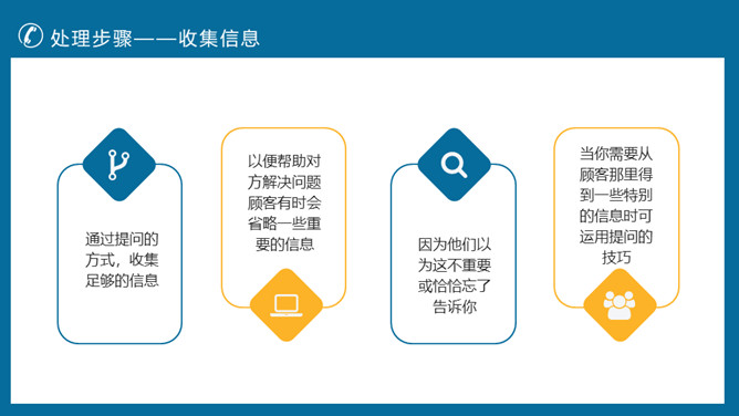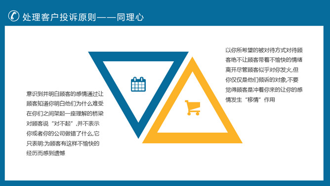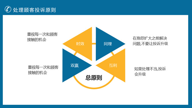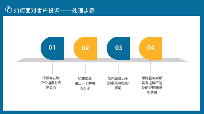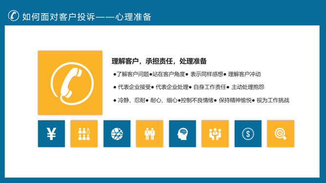 客户投诉处理技巧培训PPT模板。客户投诉是指客户对企业产品质量或服务上的不满意而提出的书面或口头上的异议、抗议、索赔和要求解决问题等行为。