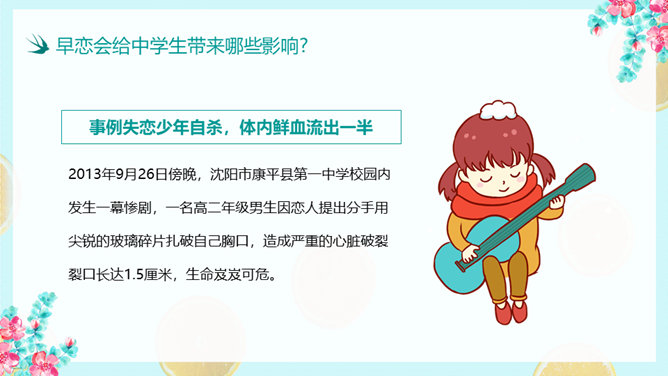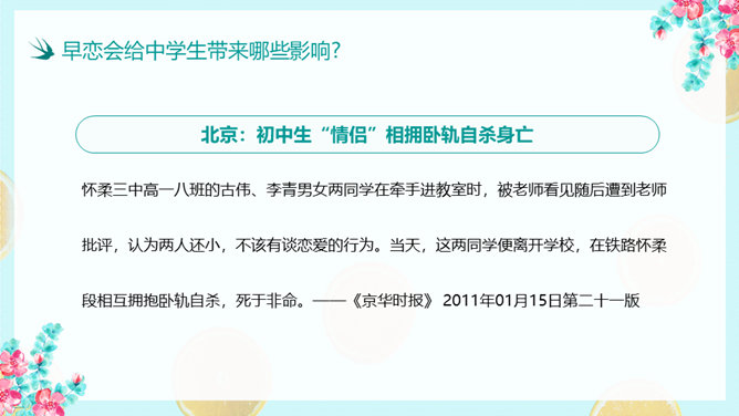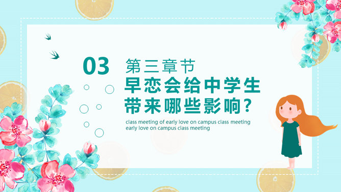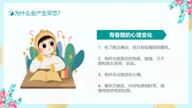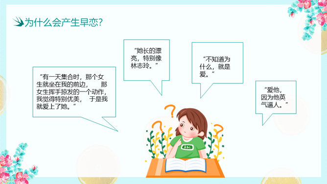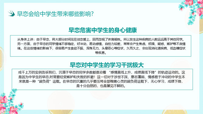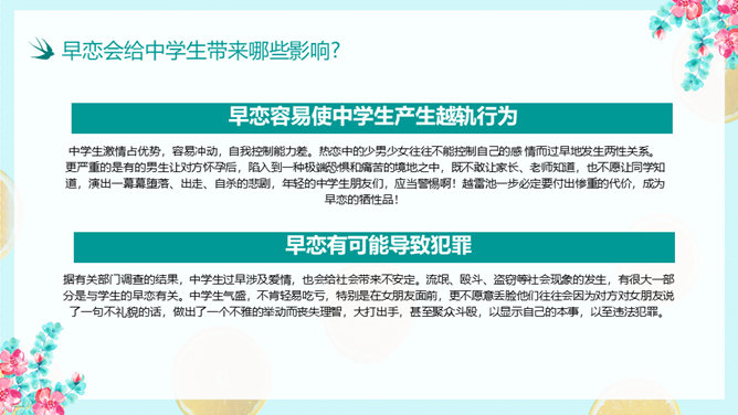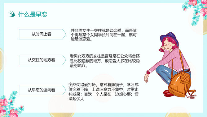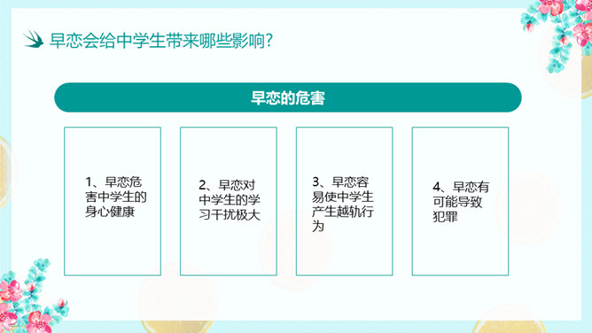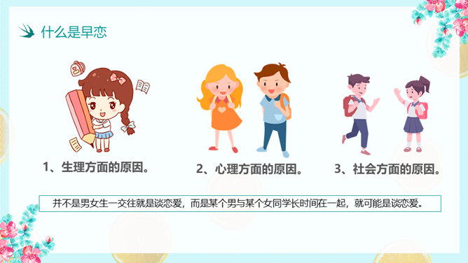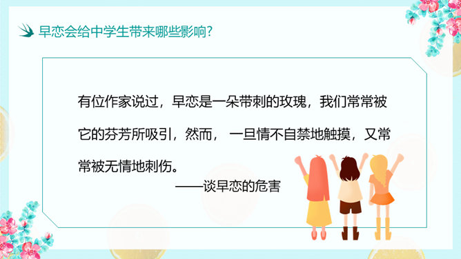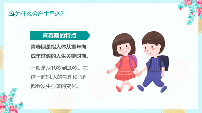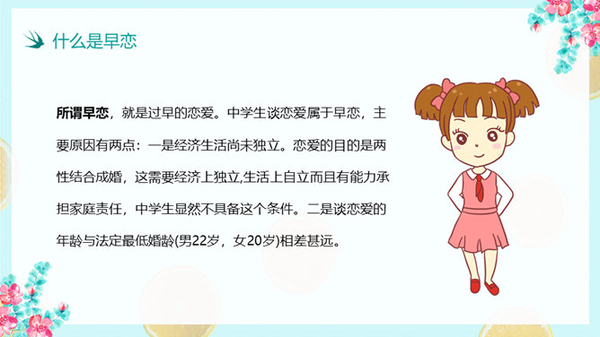 防早恋主题教育班会PPT模板。什么是早恋。为什么会产生早恋?早恋会给中学生带来哪些影响?怎样避免早恋?