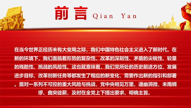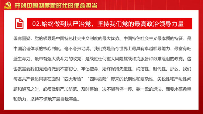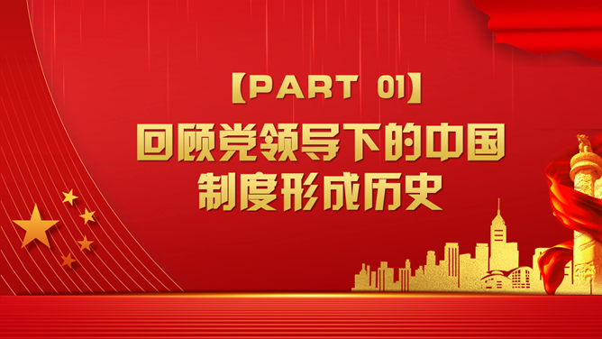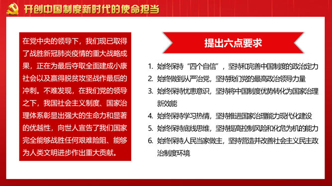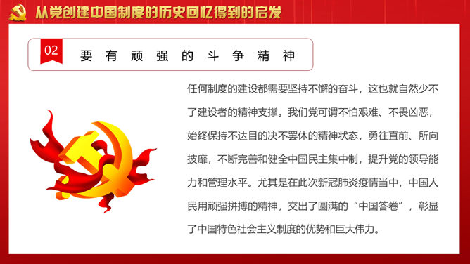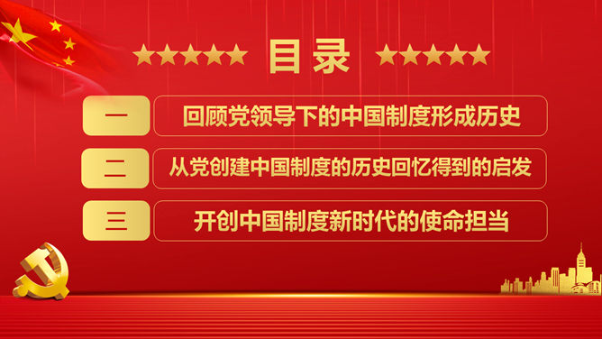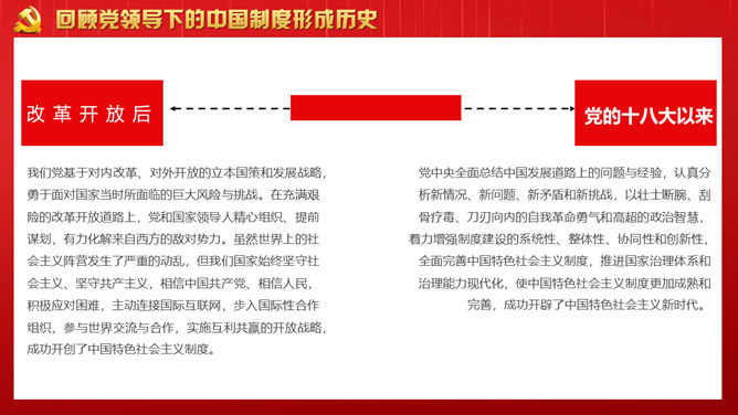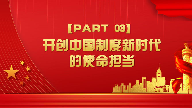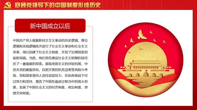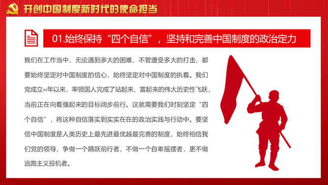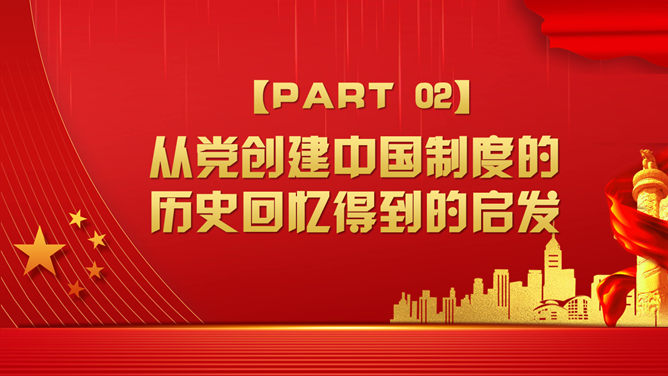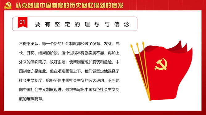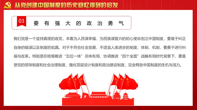 战胜重大风险与挑战PPT模板。回顾党领导下的中国制度形成历史。从党创建中国制度的历史回忆得到的启发。开创中国制度新时代的使命担当。