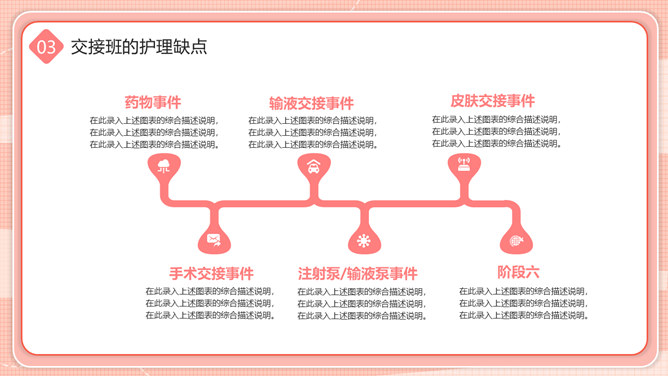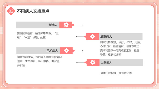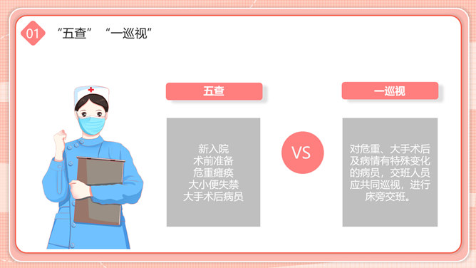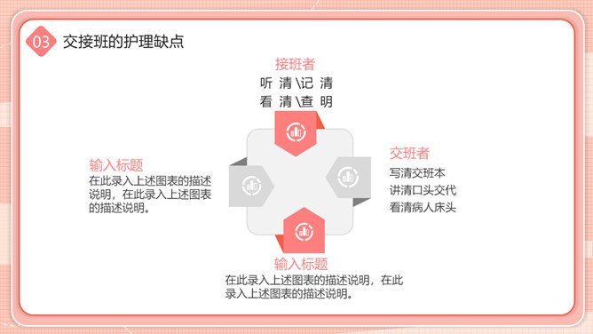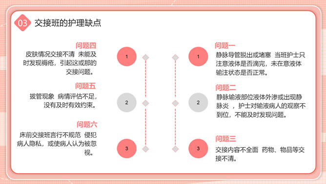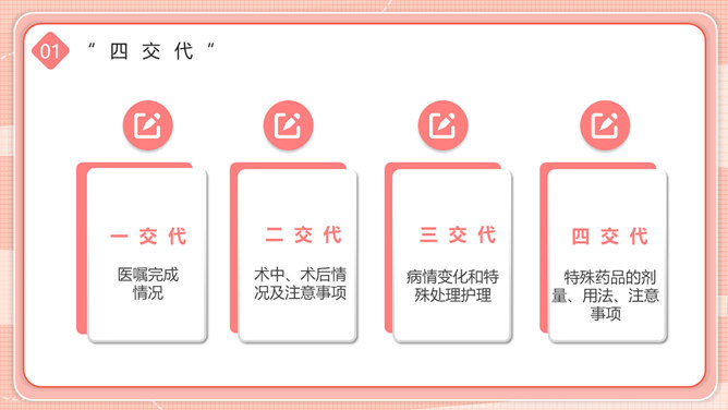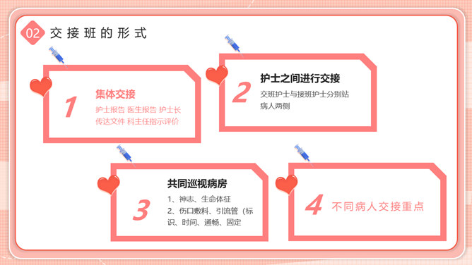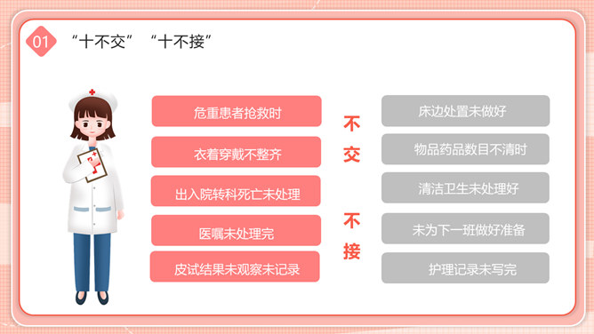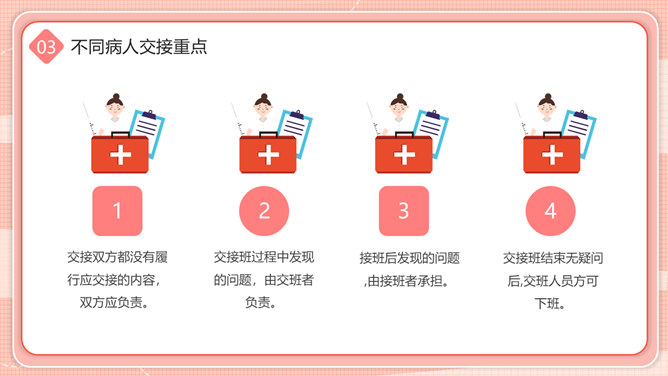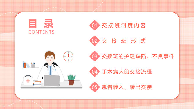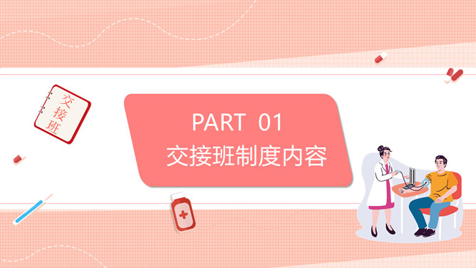 护士护理交接班制度培训PPT模板。交接班制度内容,交接班形式,交接班的护理缺陷、不良事件,手术病人的交接流程,患者转入、转出交接。