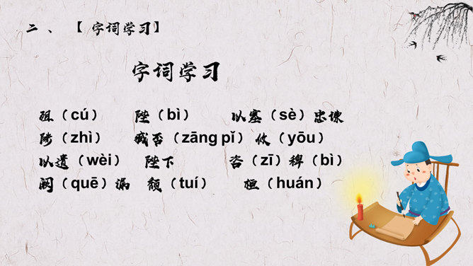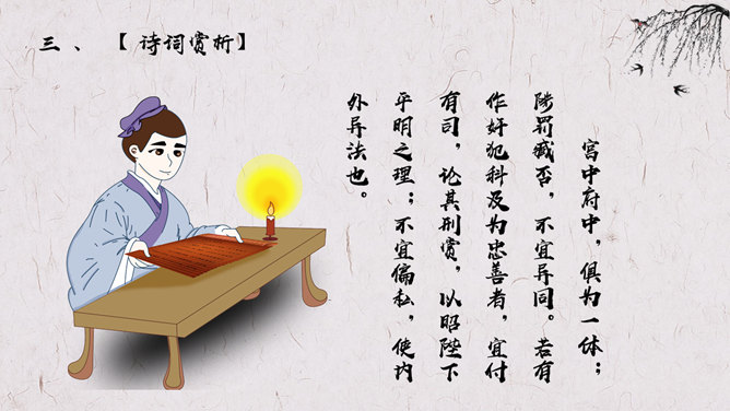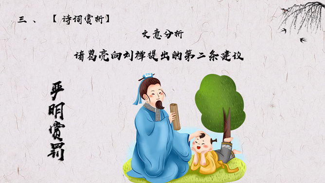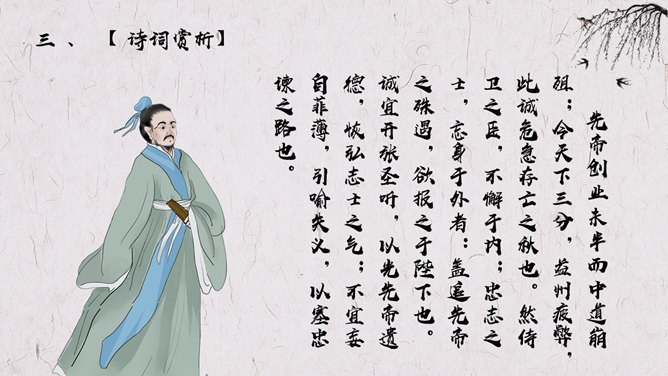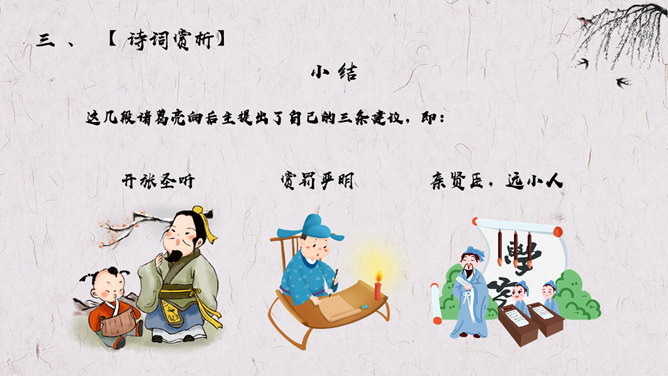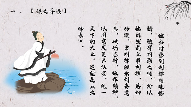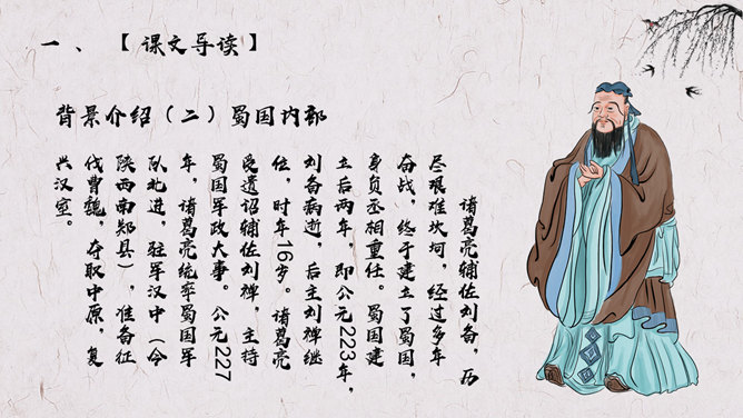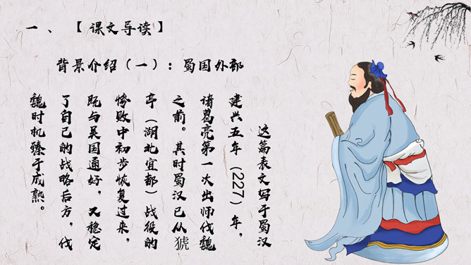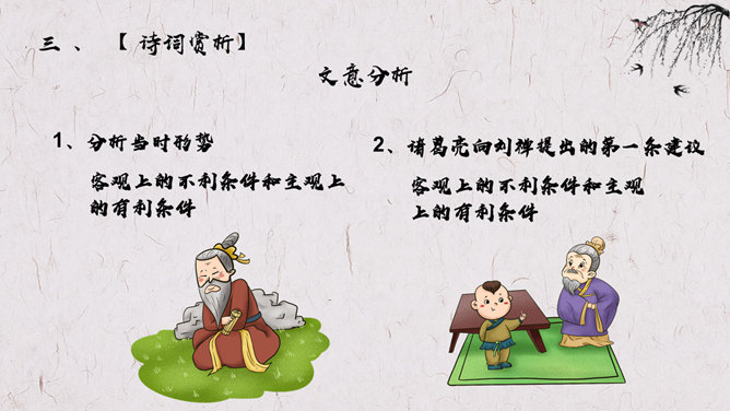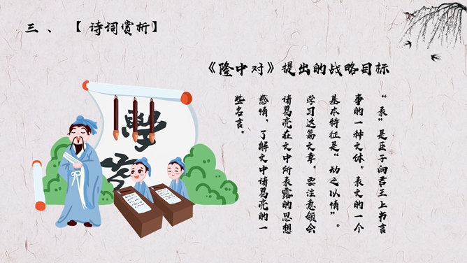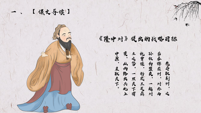 《隆中对》提出的战略目标:先夺取荆州,之后吞掉益州,对外与孙权为盟友,一起对抗曹操,形成三足鼎立之势。一旦天下有变,从两路出兵北上中原,直取天下。 他当时感到刘禅暗昧懦弱,颇有内顾之忧,所以临出发前上书刘禅,恳切劝谏,要刘禅继承刘备遗志,砥砺志行,振作精神,以图完成复兴汉室,统一天下的大业。这就是《出师表》。 文意分析:1、分析当时形势 。客观上的不利条件和主观上的有利条件。2、诸葛亮向刘禅提出的第一条建议。所属专题:出师表ppt。