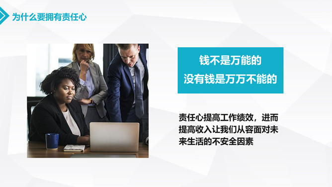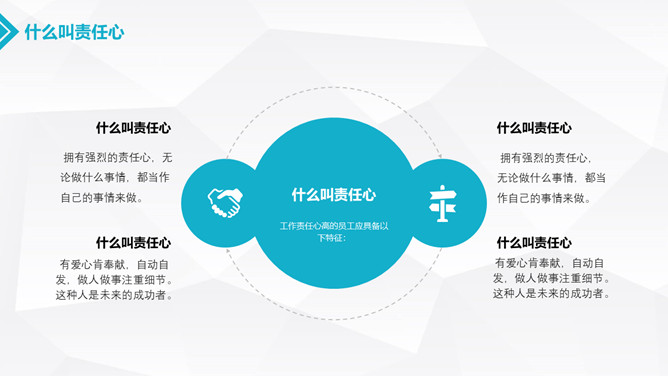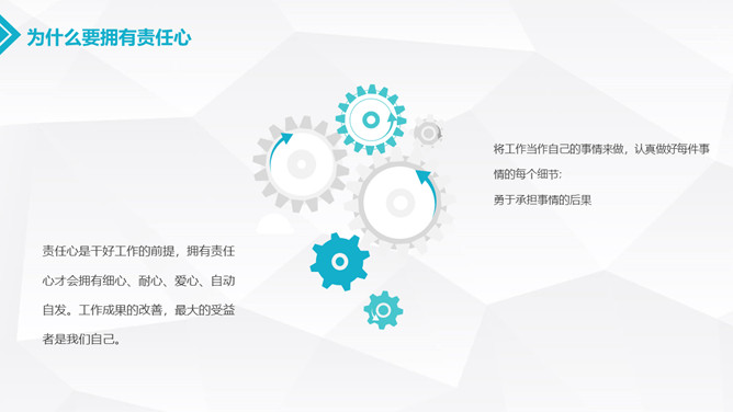 如何提高工作责任心PPT模板。什么叫责任心、为什么要拥有责任心、如何提升责任心、为成功坚定几个信念。