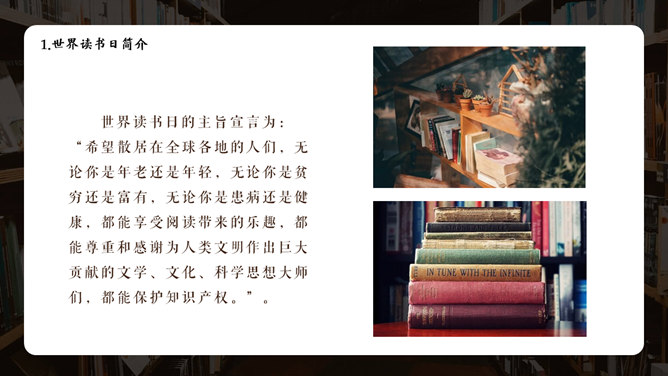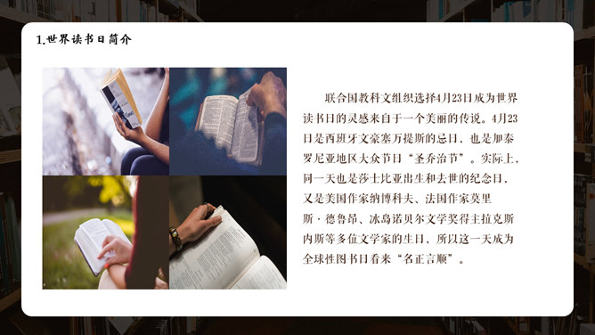 书籍图书世界读书日PPT模板。世界读书日简介、名人读书名言、古代名人读书故事、名人读书方法、读书知识问答。