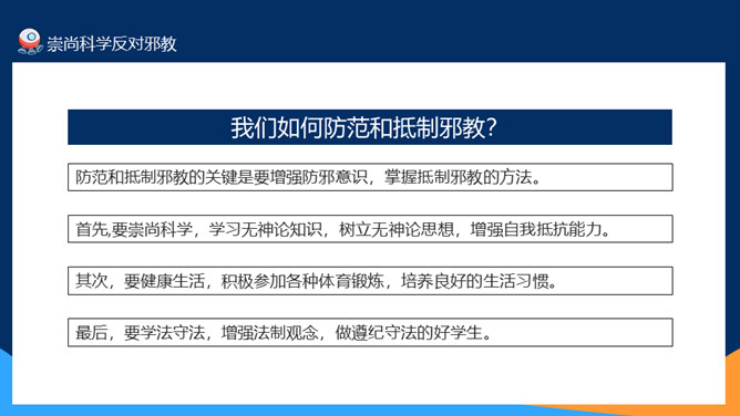 崇尚科学反对邪教教育班会PPT模板。防范和抵制邪教的关键是要增强防邪意识,掌握抵制邪教的方法。首先,要崇尚科学,学习无神论知识,树立无神论思想,增强自我抵抗能力。
