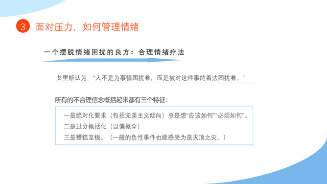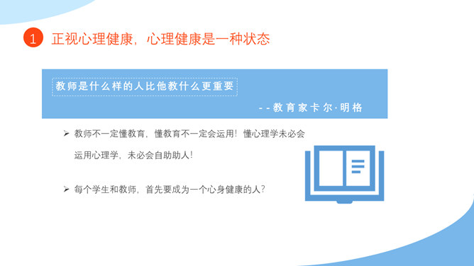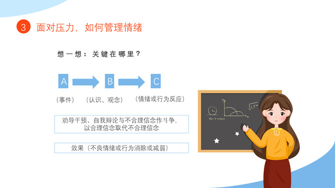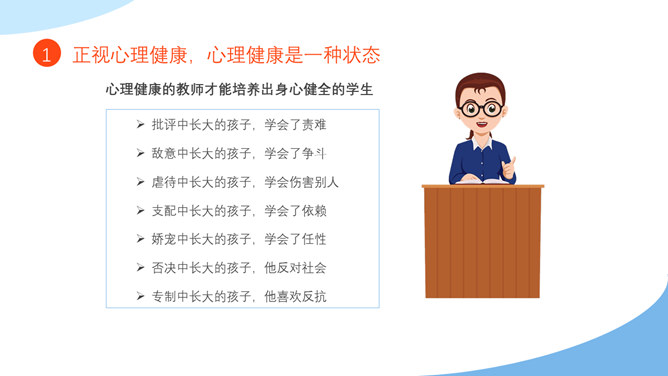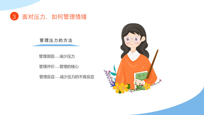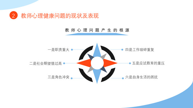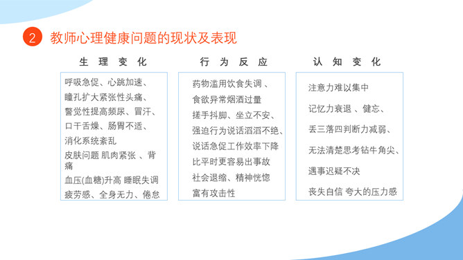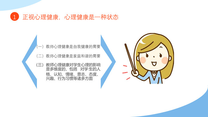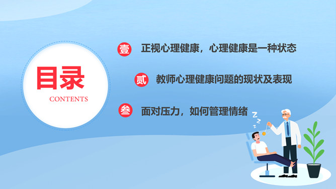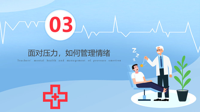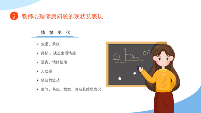 教师心理健康压力情绪管理PPT模板。正视心理健康,心理健康是一种状态。教师心理健康问题的现状及表现。面对压力,如何管理情绪。