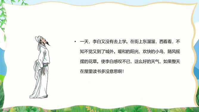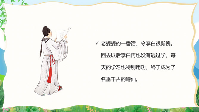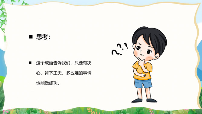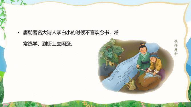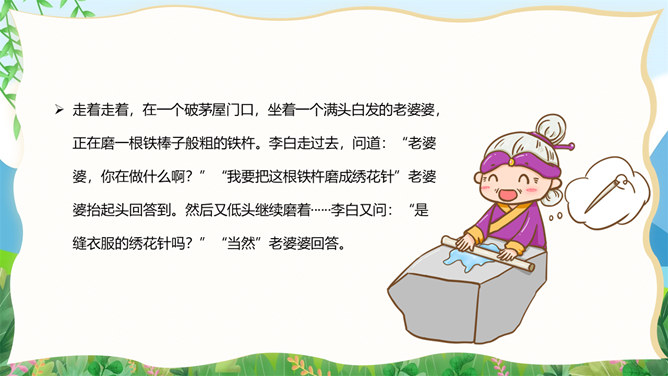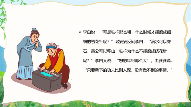 成语故事铁杵磨成针PPT课件。唐朝著名大诗人李白小的时候不喜欢念书,常常逃学,到街上去闲逛。走着走着,在一个破茅屋门口,坐着一个满头白发的老婆婆,正在磨一根铁棒子般粗的铁杵。思考:这个成语告诉我们,只要有决心,肯下工夫,多么难的事情也能做成功。