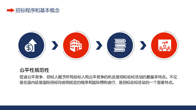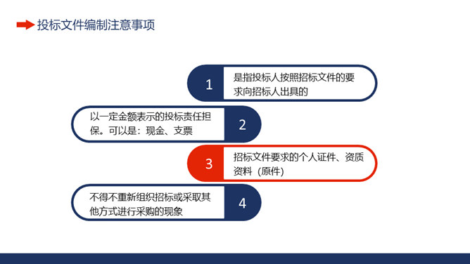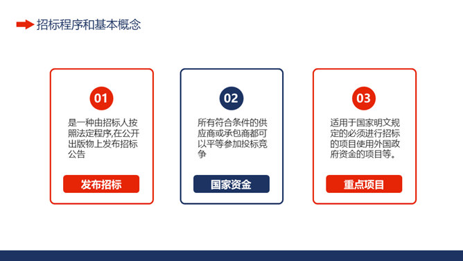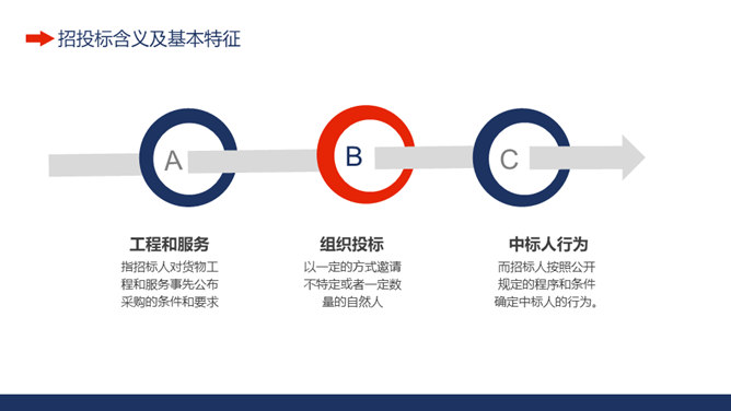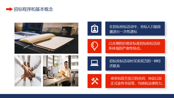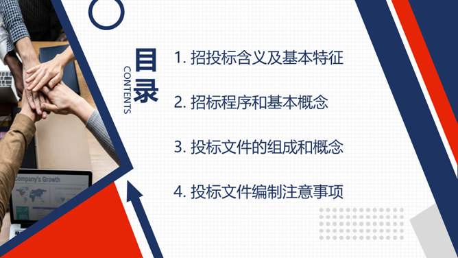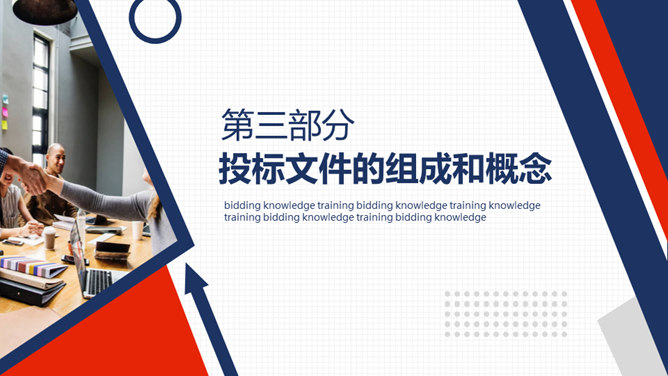 工程项目招标投标知识培训PPT模板。招投标含义及基本特征、招标程序和基本概念、投标文件的组成、投标文件编制注意事项。