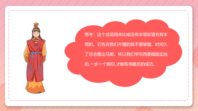 成语故事滥竽充数PPT课件。这个成语用来比喻没有本领却冒充有本领的。它告诉我们不懂的就不要装懂,时间久了总会露出马脚。所以我们学东西要脚踏实地的,一步一个脚印,才能取得最后的成功。