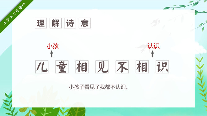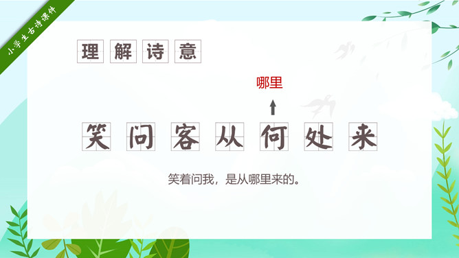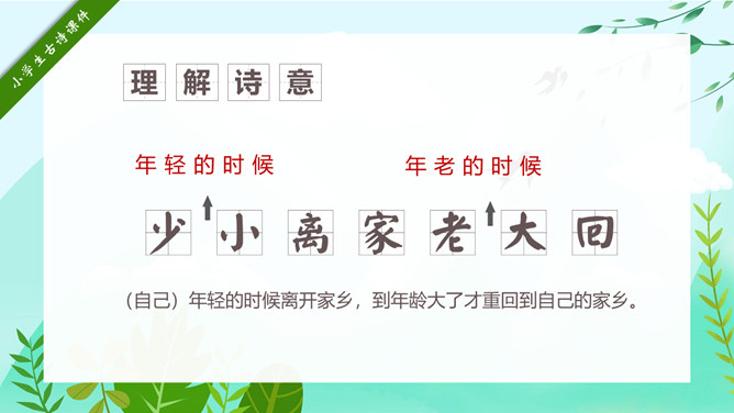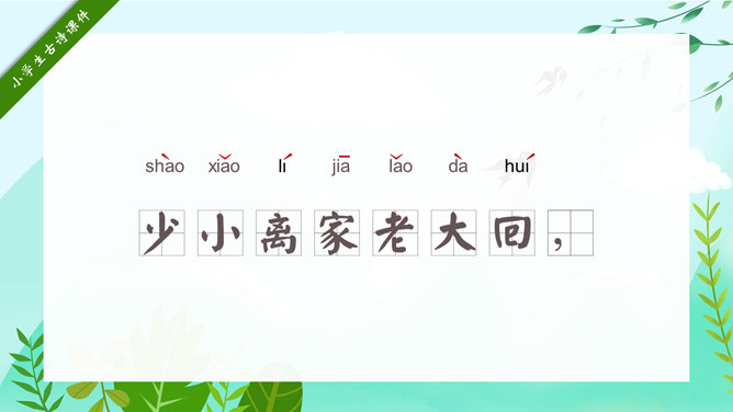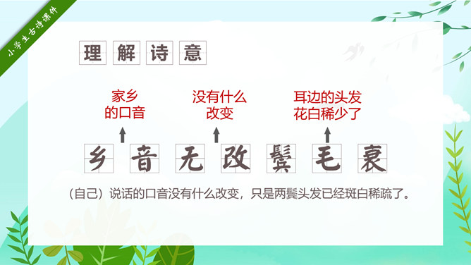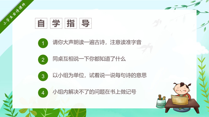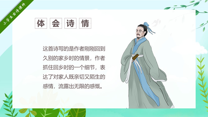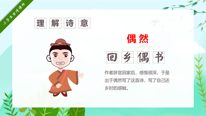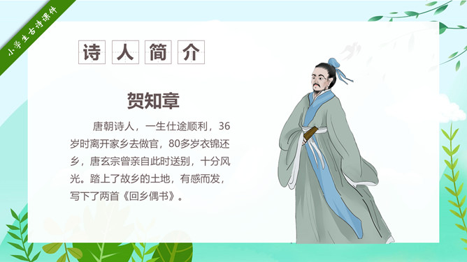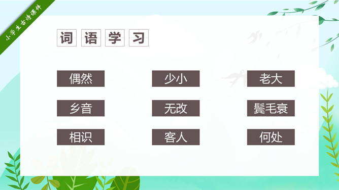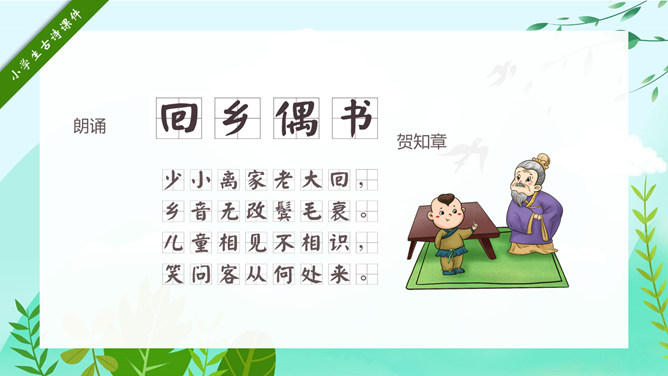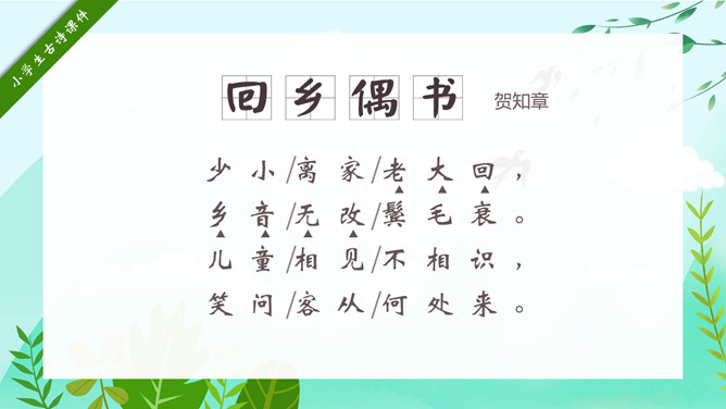回乡偶书PPT课件15。自学指导:请你大声朗读一遍古诗,注意读准字音。同桌互相说一下你都知道了什么。以小组为单位,试着说一说每句诗的意思。小组内解决不了的问题在书上做记号。课后作业:(1)熟读并背诵《回乡偶书》。(2)把《回乡偶书》编成一个小故事说给父母听。