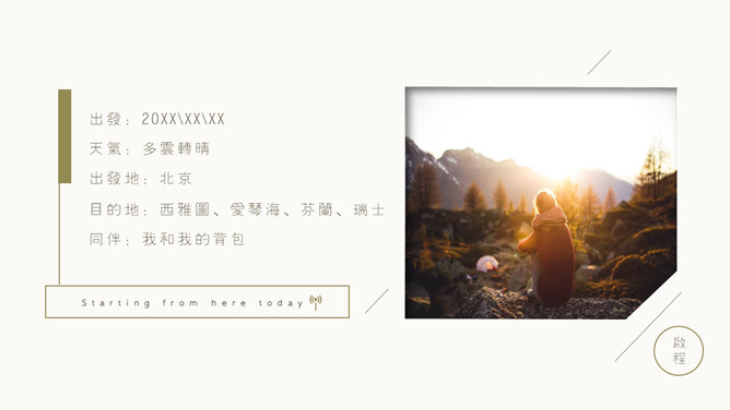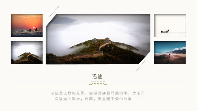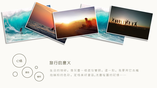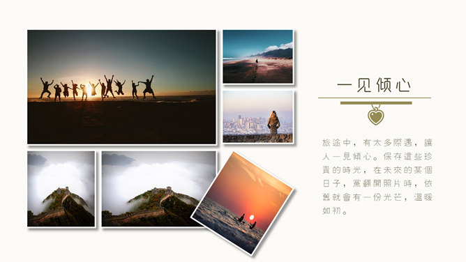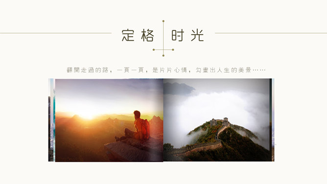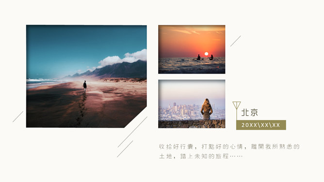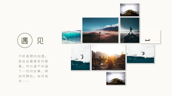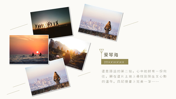 旅行日记摄影照片相册图集PPT模板。一套照片图片相册幻灯片模板,多种创意图文排版,适合制作摄影图集。