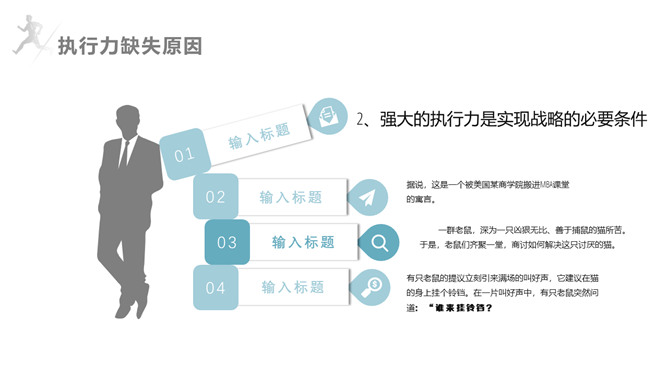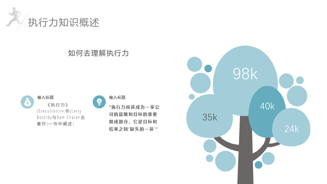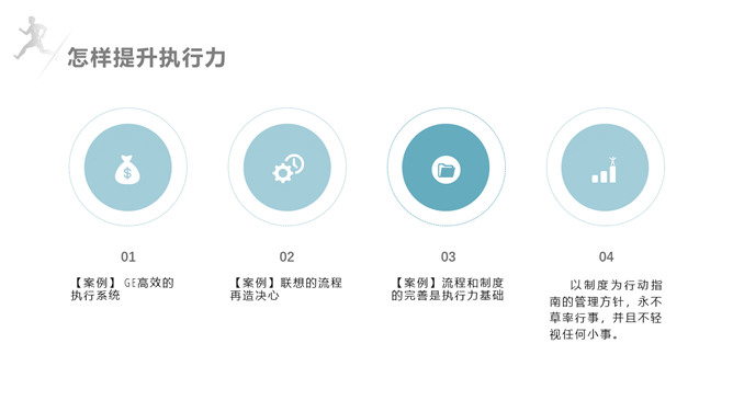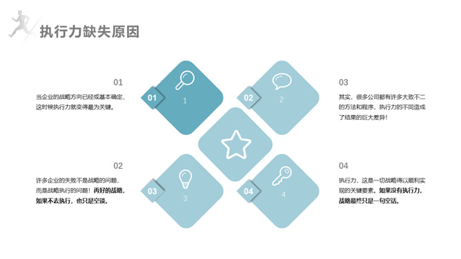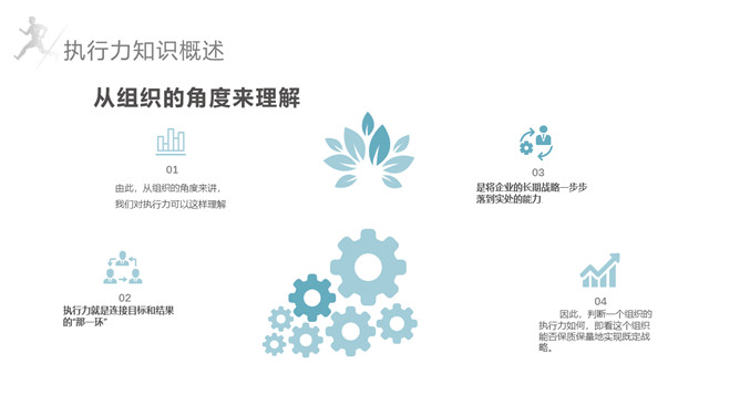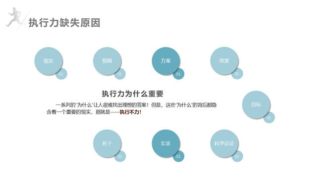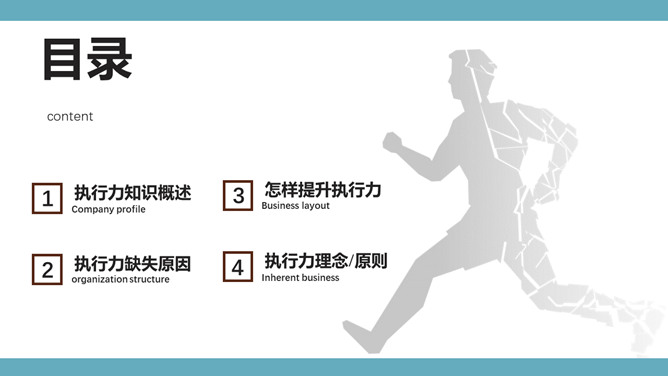 企业员工执行力培训PPT模板。包括执行力知识概述、执行力缺失原因、怎样提升执行力 、执行力理念/原则几部分。