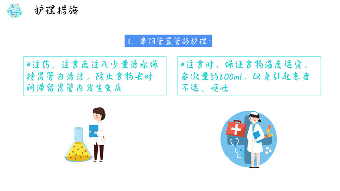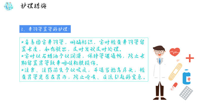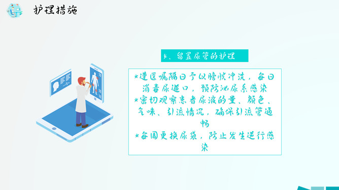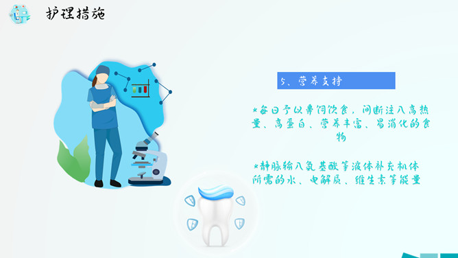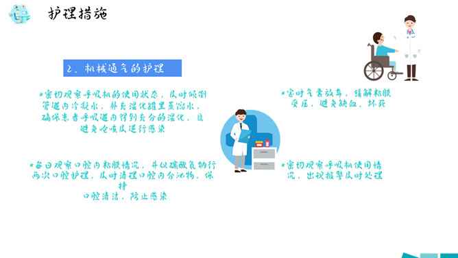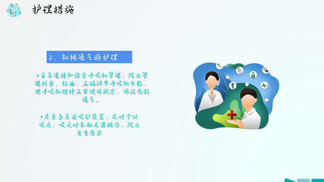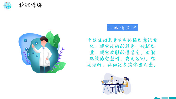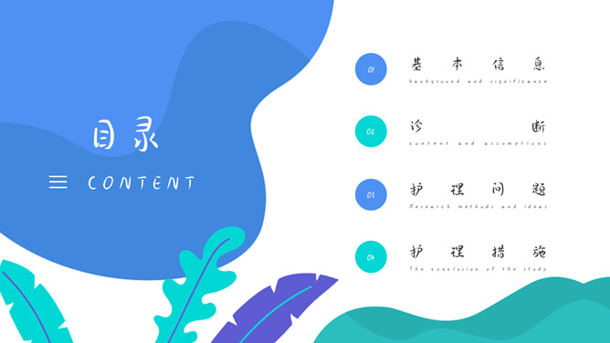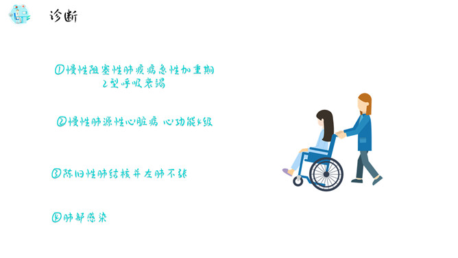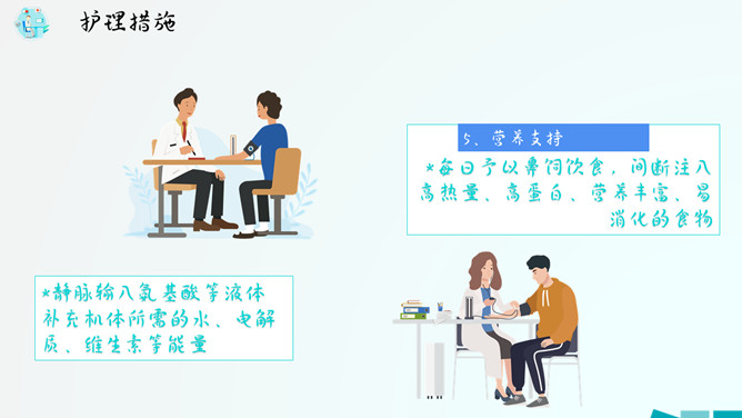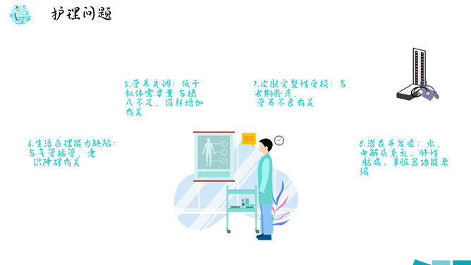医院病房护理查房PPT模板。矢量素材设计,包括基本信息、诊断、护理问题、护理措施四个部分。
