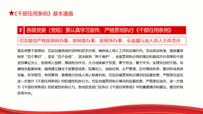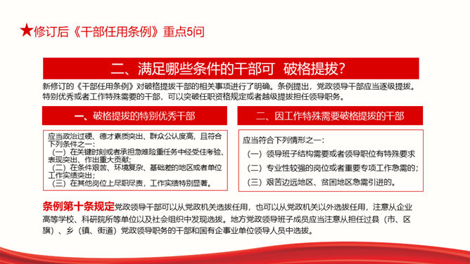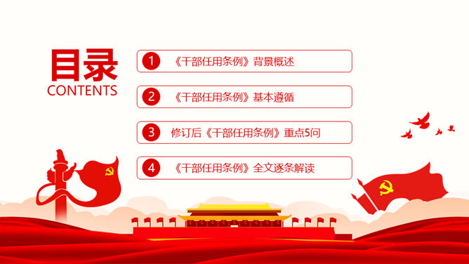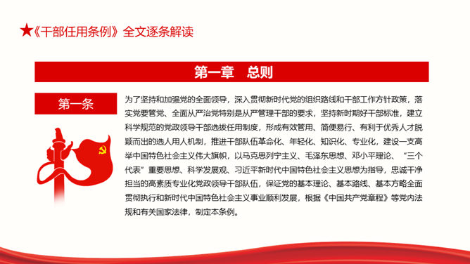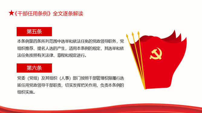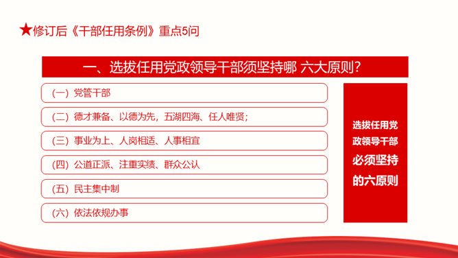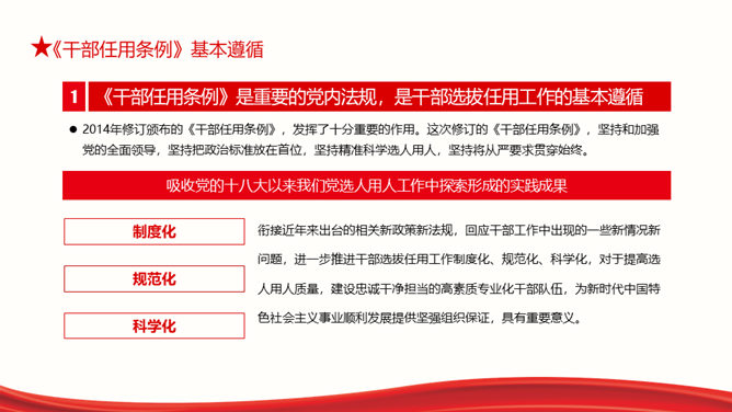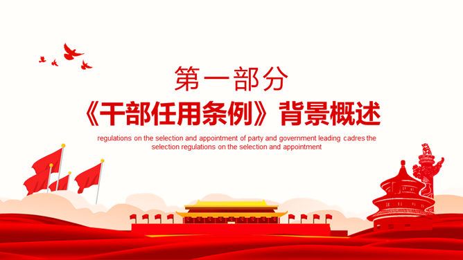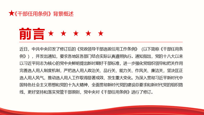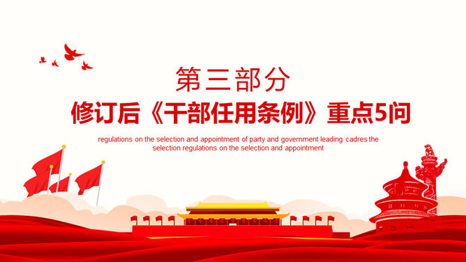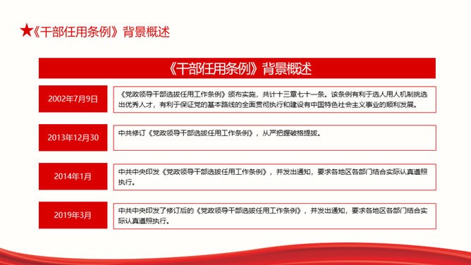 党政领导干部选拔任用工作条例PPT模板。《党政领导干部选拔任用工作条例》详细解读,包括背景概述、基本遵循、修订后重点5问、全文逐条解读几个部分。