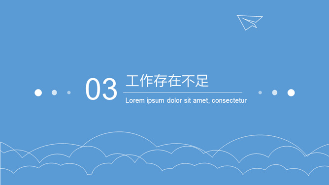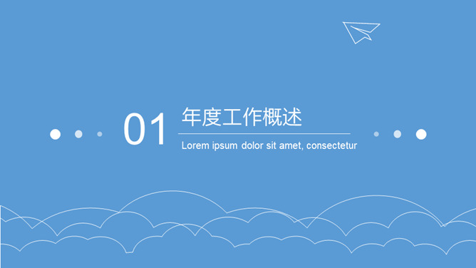 极简蓝天白云纸飞机通用PPT模板。一套简洁通用幻灯片模板,清新蓝色主色调,矢量白云蓝天纸飞机背景。