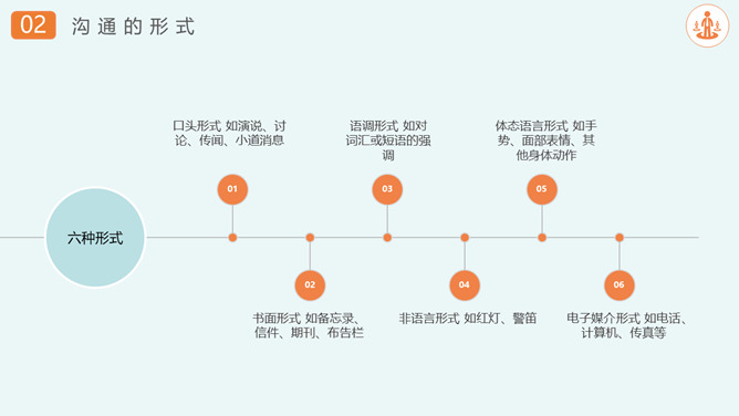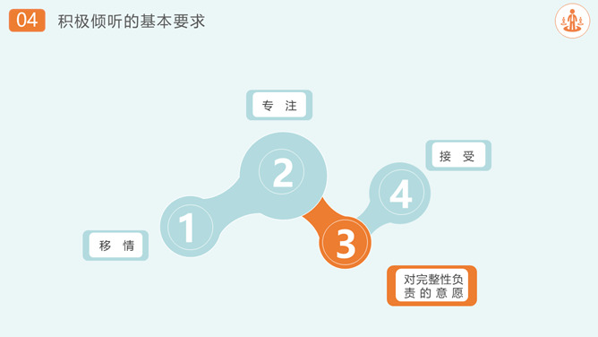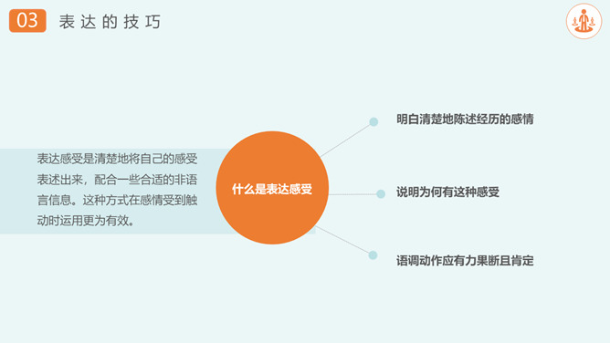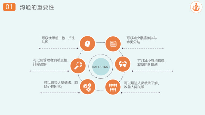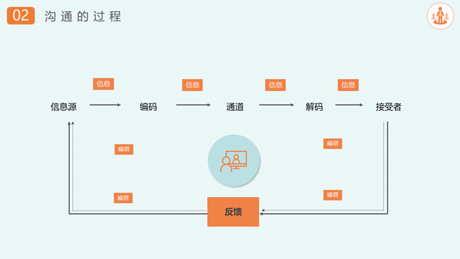 沟通技巧和方法培训PPT模板。沟通的重要性、沟通的过程、表达的技巧、积极倾听、注重和建立共同点。