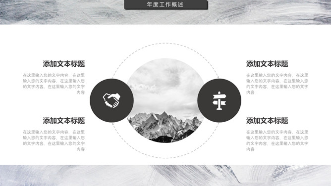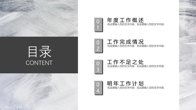 素色黑灰工作述职报告PPT模板。一套工作岗位述职报告幻灯片模板,简约设计,素雅黑灰配色,质感墨迹纹理背景。