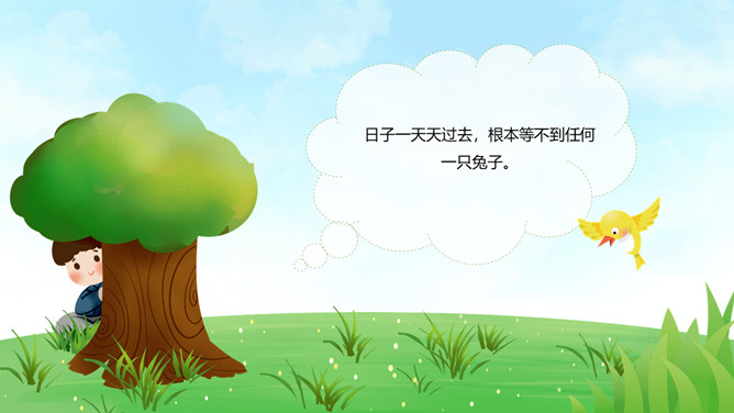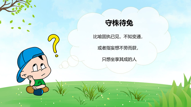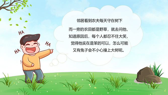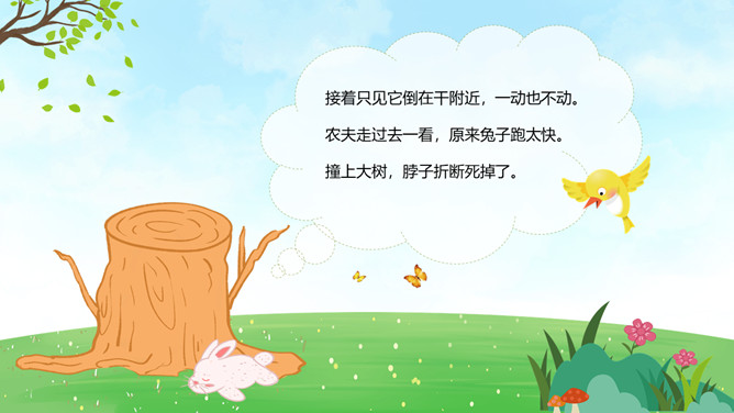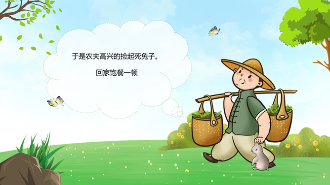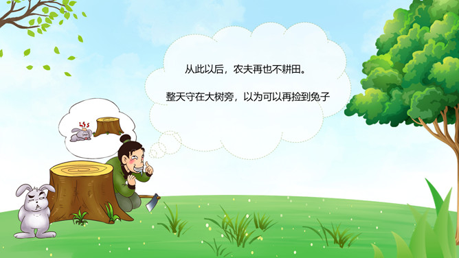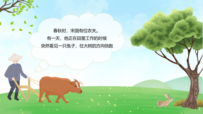 成语故事守株待兔PPT课件。春秋时,宋国有位农夫。有一天,他正在田里工作的时候突然看见一只兔子,往大树的方向快跑。接着只见它倒在干附近,一动也不动。农夫走过去一看,原来兔子跑太快。撞上大树,脖子折断死掉了。于是农夫高兴的捡起死兔子。回家饱餐一顿。从此以后,农夫再也不耕田。整天守在大树旁,以为可以再捡到兔子。守株待兔比喻固执已见,不知变通,或者指妄想不劳而获,只想坐享其成的人。