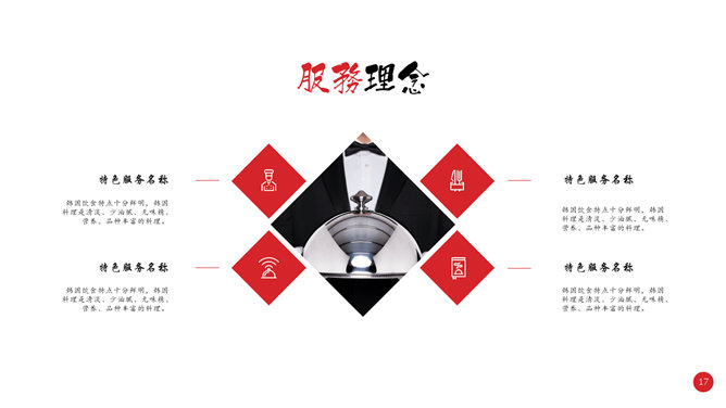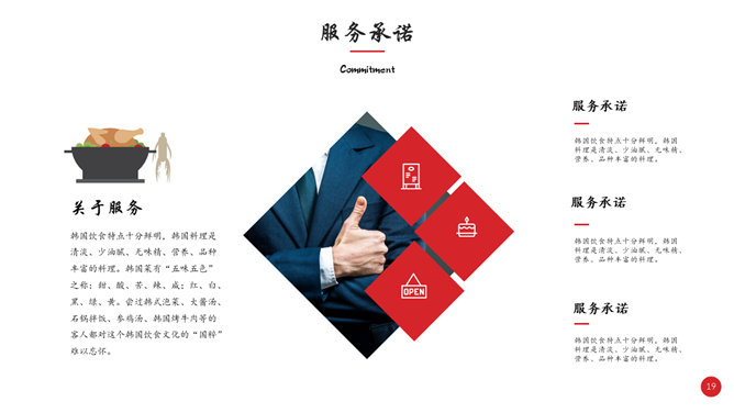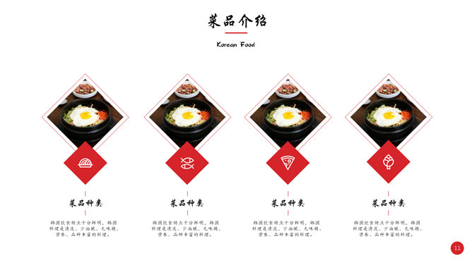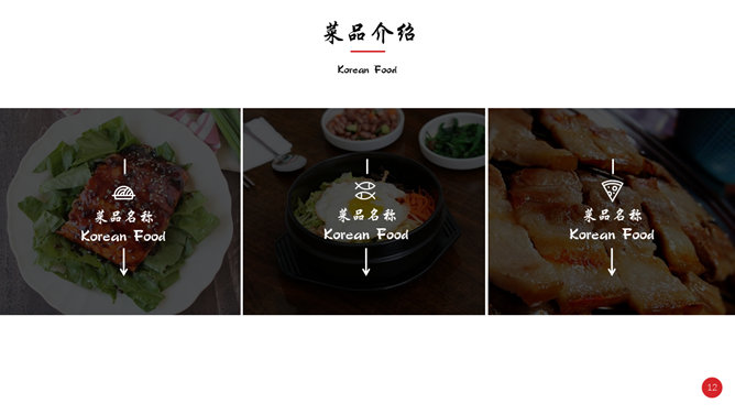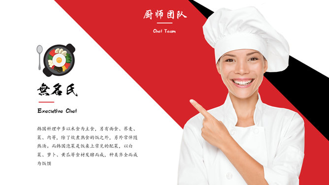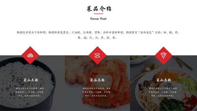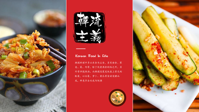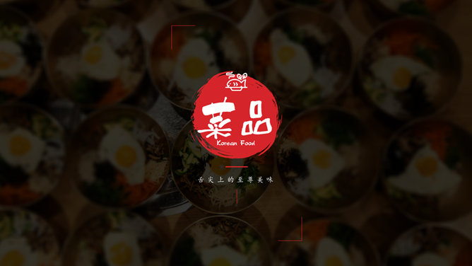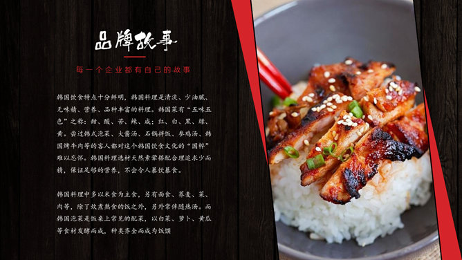 韩国料理连锁加盟介绍PPT模板。一套韩国料理主题幻灯片模板,经典黑红配色,简洁大气很有设计感,适合韩国美食介绍。