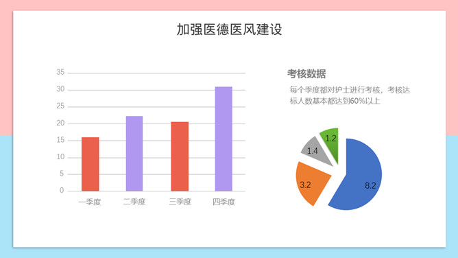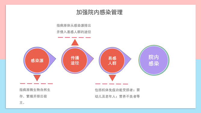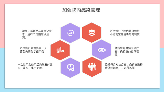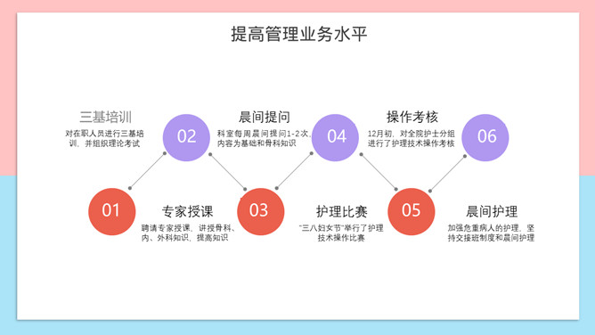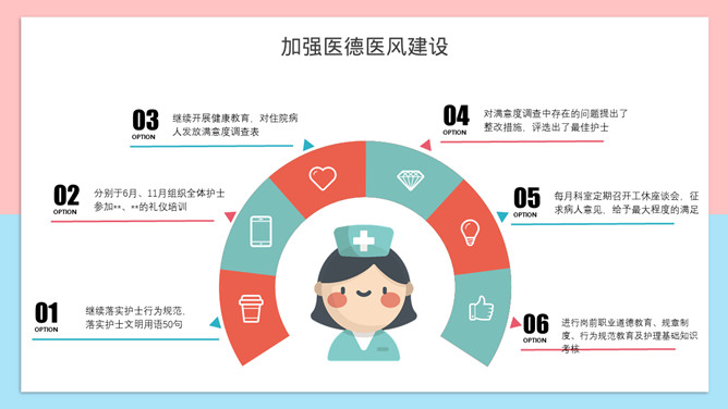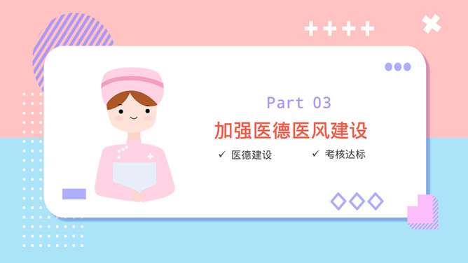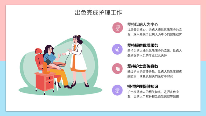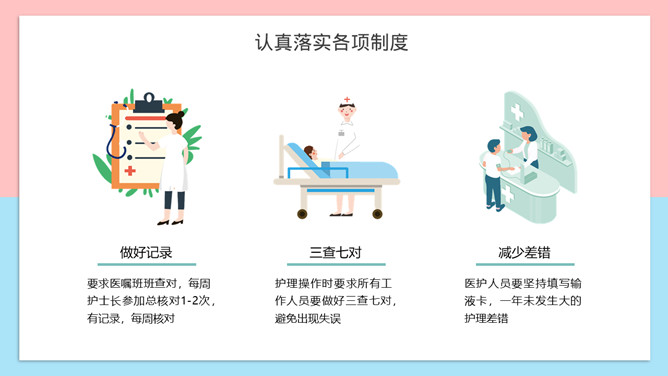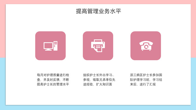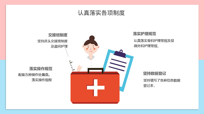 护士长竞聘述职报告PPT模板。一套护士长年终岗位竞聘工作述职报告幻灯片模板,清新蓝粉配色,包括认真落实各项制度、提高管理业务水平、加强医德医风建设、加强院内感染管理、出色完成护理工作、工作存在相关问题。