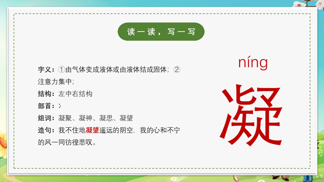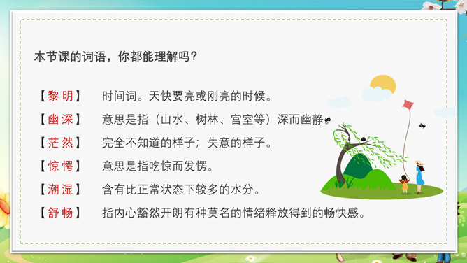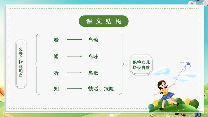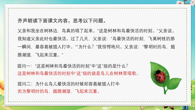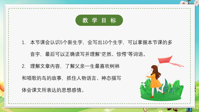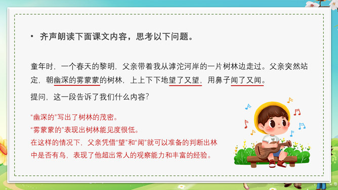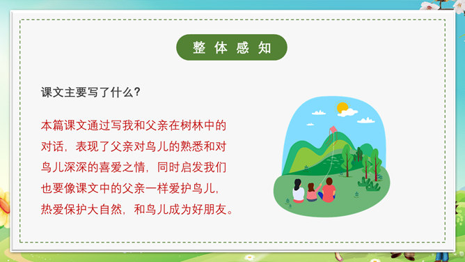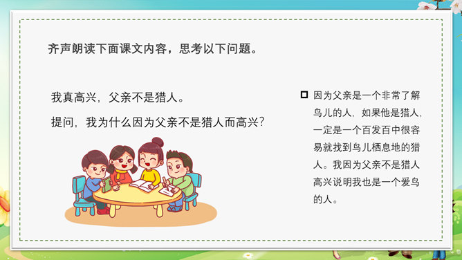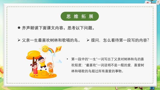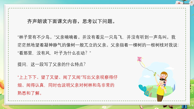 本节课会认识5个新生字,会写出10个生字,可以掌握本节课的多音字,最后可以正确读写并理解“茫然、惊愕”等词语。理解文章内容,了解父亲一生最喜欢树林和唱歌的鸟的故事,抓住人物语言、神态描写体会课文所表达的思想感情。齐声朗读下面课文内容,思考以下问题。父亲一生最喜欢树林和歌唱的鸟。提问,怎么看待第一段写的内容?第一段中的“一生”一词写出了父亲对树林和鸟的喜欢程度;“最喜欢”一词说明不是一般的爱,喜爱树林和唱歌的鸟超过所有喜爱的事物。“幽深的”写出了树林的茂密。“雾蒙蒙的”表现出树林能见度很低。在这样的情况下,父亲凭借“望”和“闻”就可以准备的判断出林中是否有鸟,表现了他超出常人的观察能力和丰富的经验。“上上下下、望了又望、闻了又闻”写出父亲观察得仔细、闻得认真,同时也说明父亲对树林和鸟非常的熟悉和了解。所属专题:父亲树林和鸟ppt。