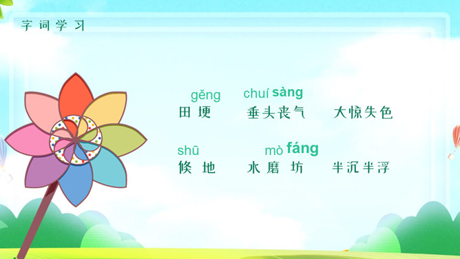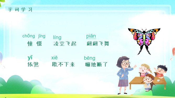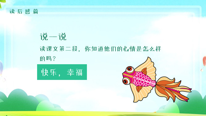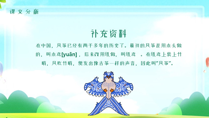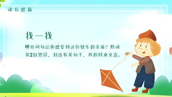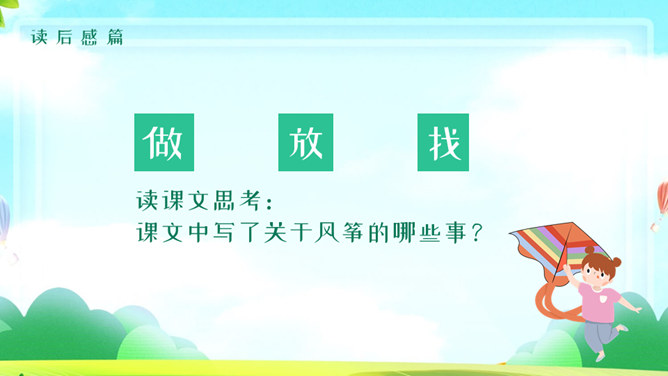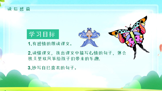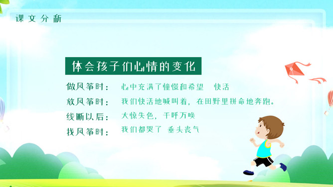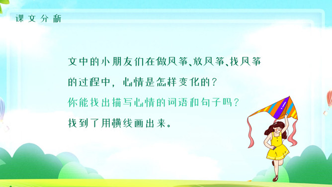 风筝PPT课件5。学习目标:1、有感情的朗读课文。2、读懂课文,找出课文中描写心情的句子,体会秋天里放风筝给孩子们带来的乐趣。3、抄写自己喜欢的句子。读课文思考:课文中写了关于风筝的哪些事? 说一说,读课文第二段,你知道他们的心情是怎么样的吗?找一找,哪些词句让你感受到这份快乐和幸福?默读第2自然段,划出有关句子,再和同桌交流。文中的小朋友们在做风筝、放风筝、找风筝的过程中,心情是怎样变化的?你能找出描写心情的词语和句子吗? 找到了用横线画出来。体会孩子们心情的变化。做风筝时:心中充满了憧憬和希望 快活 。放风筝时:我们快活地喊叫着,在田野里拼命地奔跑。线断以后:大惊失色,千呼万唤 。找风筝时:我们都哭了 垂头丧气。
