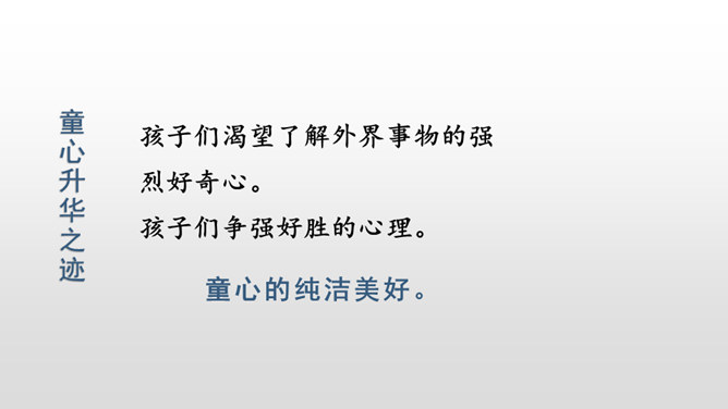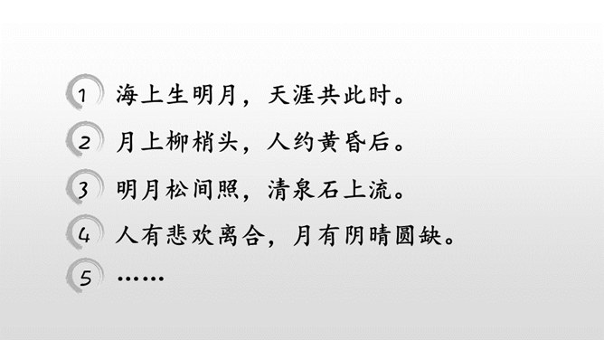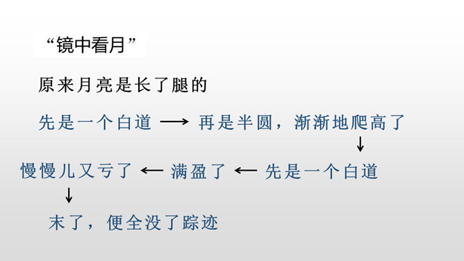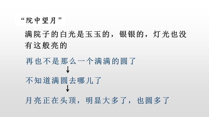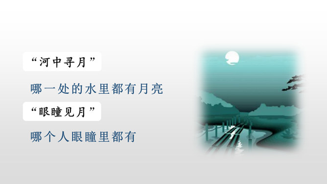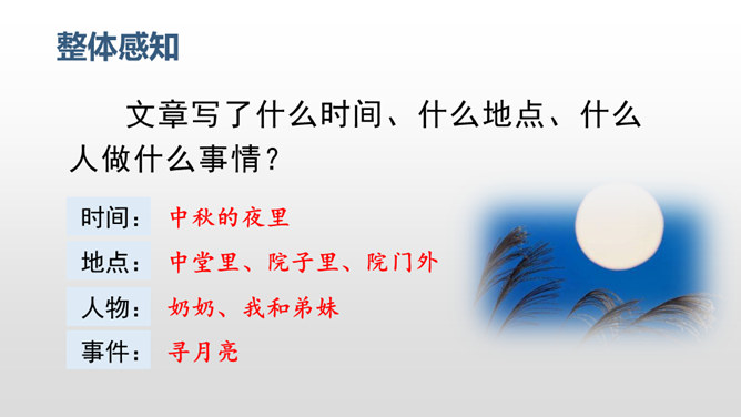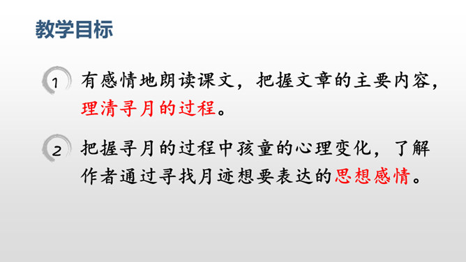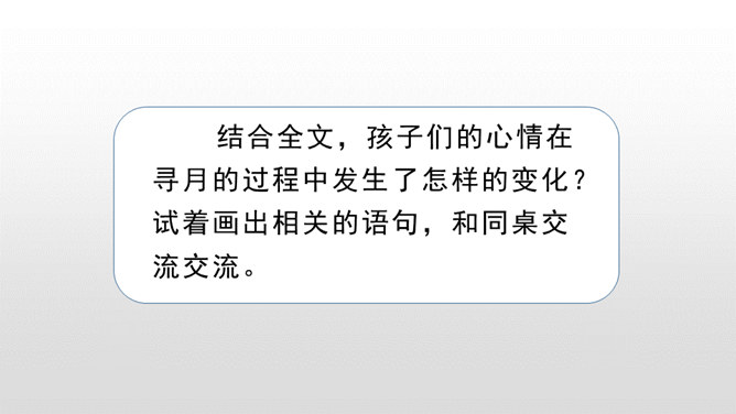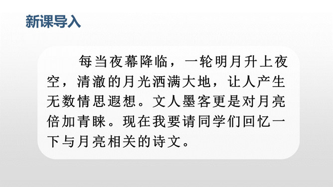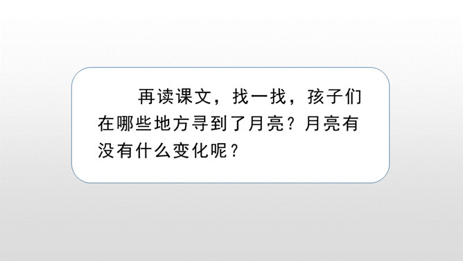 每当夜幕降临,一轮明月升上夜空,清澈的月光洒满大地,让人产生无数情思遐想。文人墨客更是对月亮倍加青睐。现在我要请同学们回忆一下与月亮相关的诗文。有感情地朗读课文,把握文章的主要内容,理清寻月的过程。把握寻月的过程中孩童的心理变化,了解作者通过寻找月迹想要表达的思想感情。文章写了什么时间、什么地点、什么人做什么事情?再读课文,找一找,孩子们在哪些地方寻到了月亮?月亮有没有什么变化呢?所属专题:月迹ppt。