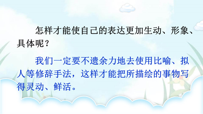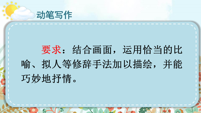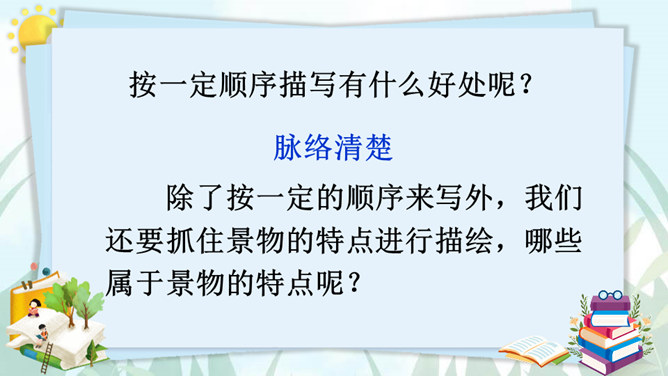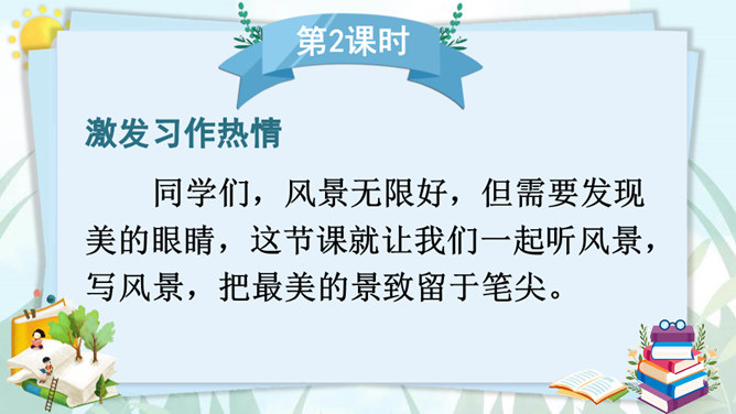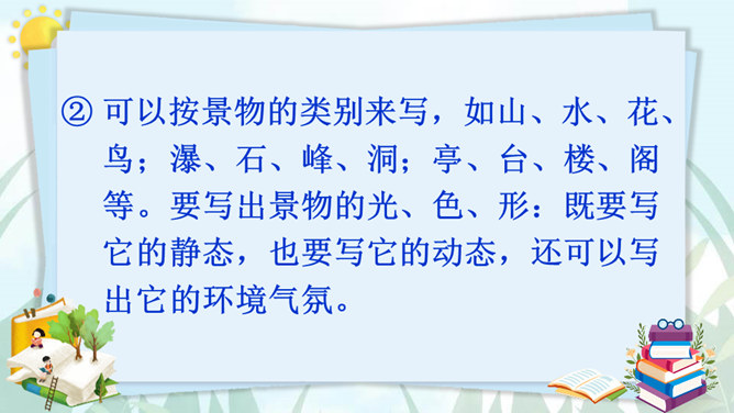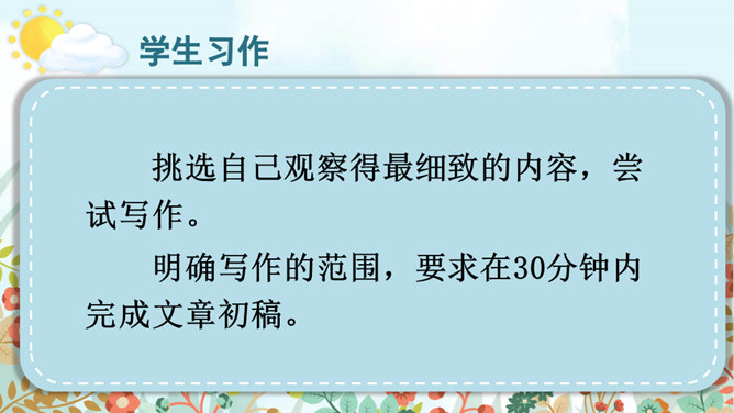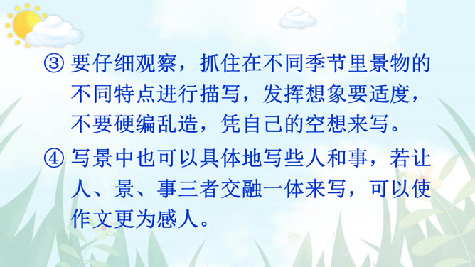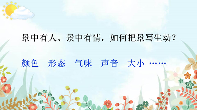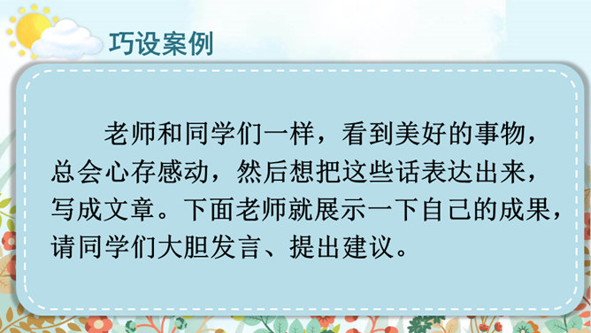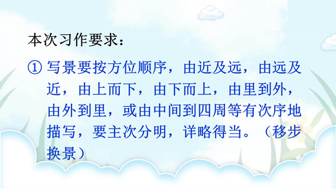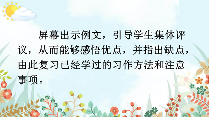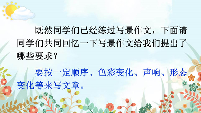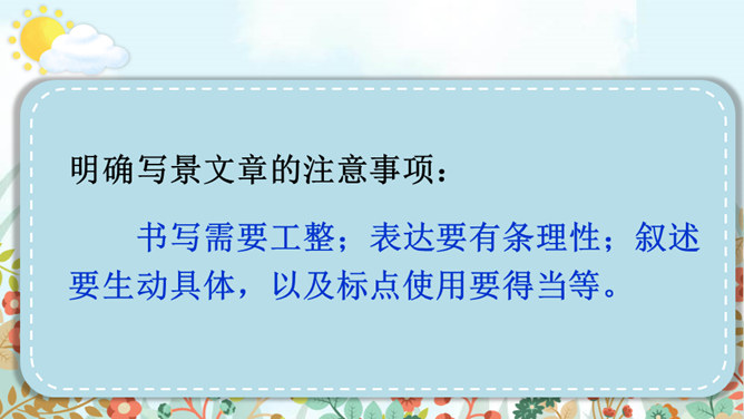 老师和同学们一样,看到美好的事物,总会心存感动,然后想把这些话表达出来,写成文章。下面老师就展示一下自己的成果,请同学们大胆发言、提出建议。屏幕出示例文,引导学生集体评议,从而能够感悟优点,并指出缺点,由此复习已经学过的习作方法和注意事项。明确写景文章的注意事项:书写需要工整;表达要有条理性;叙述要生动具体,以及标点使用要得当等。既然同学们已经练过写景作文,下面请同学们共同回忆一下写景作文给我们提出了哪些要求?要按一定顺序、色彩变化、声响、形态变化等来写文章。所属专题:即景ppt。