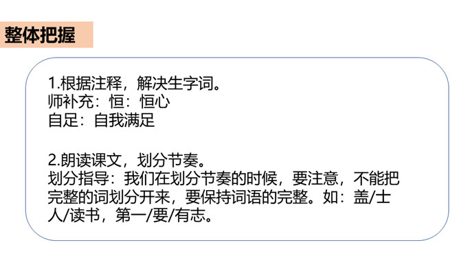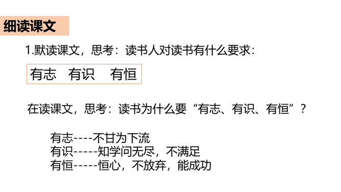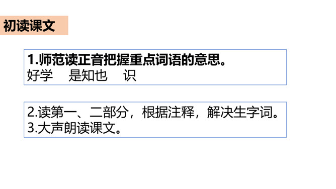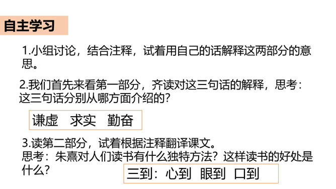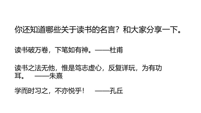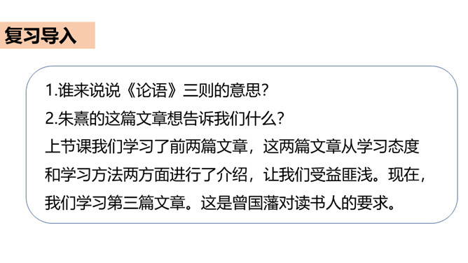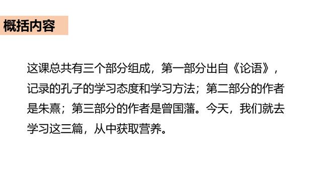 同学们,你知道哪些古人读书的故事?谁来给我们讲一讲?古人喜欢读书,古人又把自己的读书方法和学习态度写下来,供后世参考。今天,我们就学习《古人谈读书》这篇文章,去看看古人是如何对待学习的。这课总共有三个部分组成,第一部分出自《论语》,记录的孔子的学习态度和学习方法;第二部分的作者是朱熹;第三部分的作者是曾国藩。今天,我们就去学习这三篇,从中获取营养。所属专题:古人谈读书ppt。