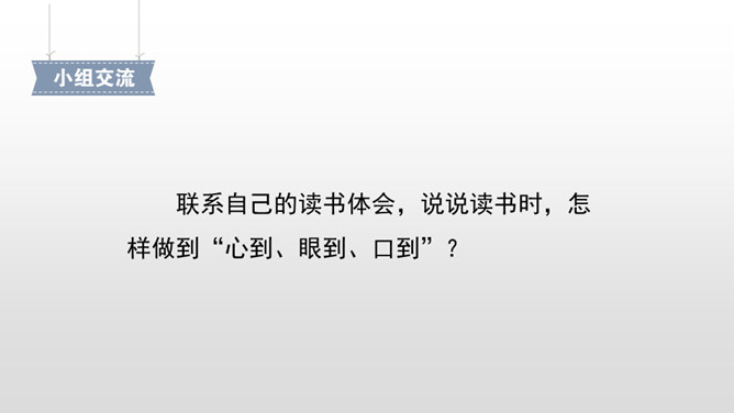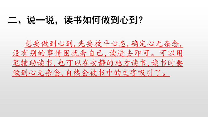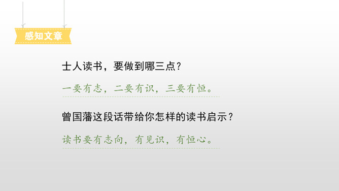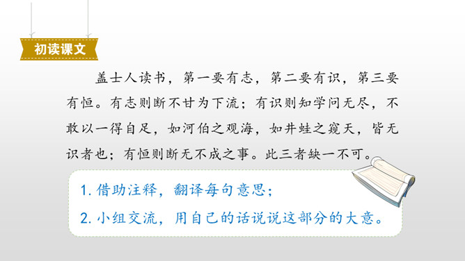 读书有哪三到?心到、眼到、口到。如果不“心到”会怎样?找出文中相关语句。“三到之中”,哪个最急?“急”在这里是什么意思?心到最急。“急”古义和今义不同,在这里是要紧、重要的意思。联系自己的读书体会,说说读书时,怎样做到“心到、眼到、口到”?1.借助注释,翻译每句意思;2.小组交流,用自己的话说说这部分的大意。士人读书,要做到哪三点?一要有志,二要有识,三要有恒。曾国藩这段话带给你怎样的读书启示?所属专题:古人谈读书ppt。